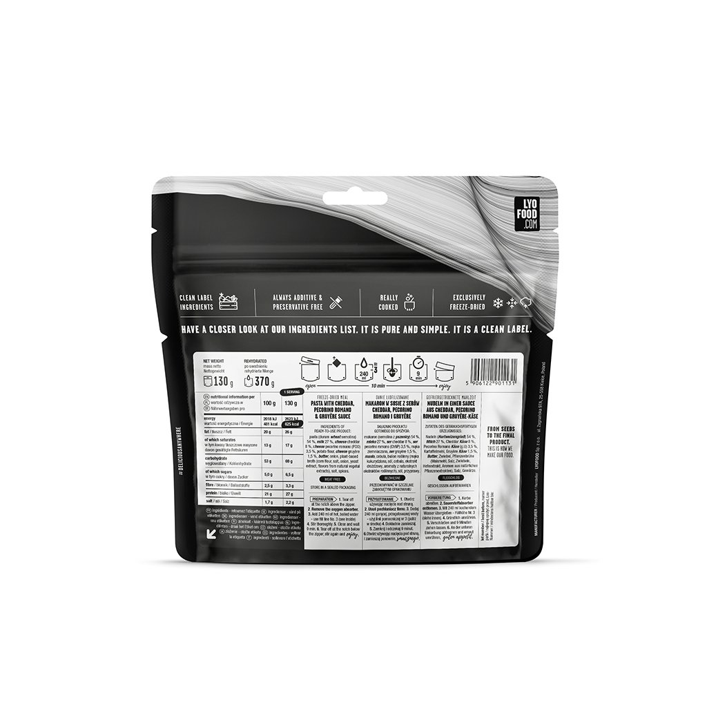 Pokud věříte, že sýr dokáže každé jídlo chuťově vylepšit, nejste sami. Nyní můžete uspokojit své chutě i při vícedenních expedicích. LYO Mac&Cheese je moderní verzí oblíbené klasiky: pšeničné makaronové těstoviny zalité v omáčce ze sýrové kombinace anglického Cheddaru, italského Pecorino romana (tvrdý sýr z nepasterovaného ovčího mléka) a švýcarského sýru Gruyere (z nepasterizovaného kravského mléka). Krémová textura a prolínající se chutě svedou vaše mlsné jazýčky a udělají jakoukoli venkovní večeři ještě vzrušující. Perfektní volba pro dobrodruhy, kterým nevadí dlouhé cestování a nesnesou nudné jídlo.