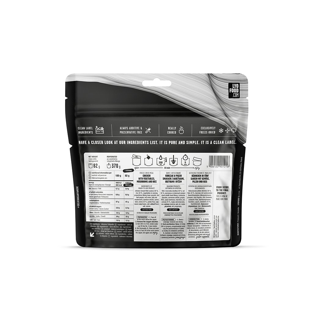 Proč byste měli LYO Five-Spice Chicken ochutnat? Tak za prvé proto, jaký skvělý je to mix! Bambusové výhonky, mungo klíčky, Jídášovo ucho se sójovou omáčkou jsou podávány s rýží, šťavnatými kousky kuřecích prsou, zeleninou a typickou směsí koření, se kterou se budete cítit jako ve vaší oblíbené čínské restauraci. Za druhé, toto jídlo by nemohlo být tak dobré, kdyby nebylo uvařeno klasickým kuchařským způsobem! Před lyofilizací vaříme naše jídla v malých dávkách, aby si zachovala svou lahodnou a autentickou chuť. Pro ty dlouhé a vyčerpávající dny strávené venku je LYO Five-Spice Chicken perfektní palivo, které vás udrží v chodu.