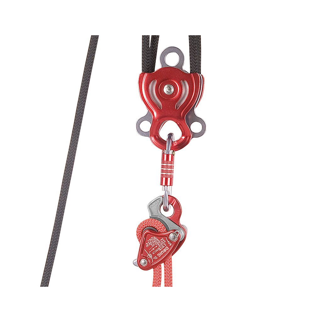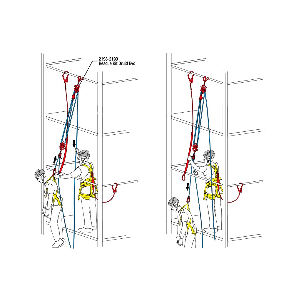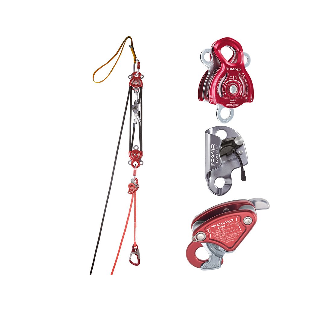 Záchranná sada s integrovaným kladkostrojem pro nadzvednutí a spuštění postiženého na zem po zachyceném pádu. Zvihový poměr kladkostroje je 4. Maximální délka nadzvednutí pacienta je 1m. Veškeré komponenty v sadě jsou s certifikací CE pro PPE.