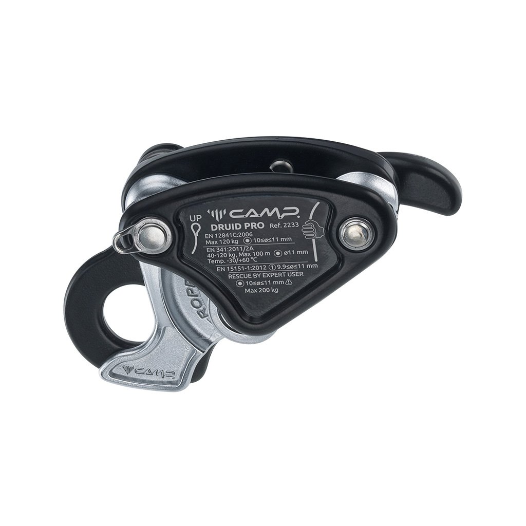 CAMP Safety DRUID PRO je lehká a kompaktní slaňovací brzda s automatickým blokováním pro práce ve výškách a záchranné složky. Brzda je určena pro statická lana o průměru 9,9 – 11 mm. Druid PRO je navržen výhradně pro zkušené uživatele, záměrně není vybaven funkcí „anti-panic“! Tělo i páka jsou vyrobeny z pevné kované slitiny hliníku. Pohyblivé části jsou z precizně odlité nerezové oceli. Uspořádání vnitřního mechanismu s vačkou je patentováno a nabízí velmi jemné ovládání lana spolu s jemným prokluzem v případě zachycení pádu, čímž šetří lano a zvyšuje tak jeho životnost. Podávání lana při jištění výstupu je usnadněno výstupkem pro pravý ukazovák, umístěným na pohyblivé části vačky u jistícího oka. Ukazovákem stačí vačku otevřít a podat tak rychle delší kus nabraného lana. Při náhodném pádu do takto uvolněné vačky nemá jistič žádnou šanci vačku jedním prstem podržet uvolněnou, vačka se při napnutí lana okamžitě zatáhne a zamezí jeho prokluzu. Ocelové očko slouží k připoutání slaňovací brzdy k pevnému bodu a zamezuje tak upuštění na zem.