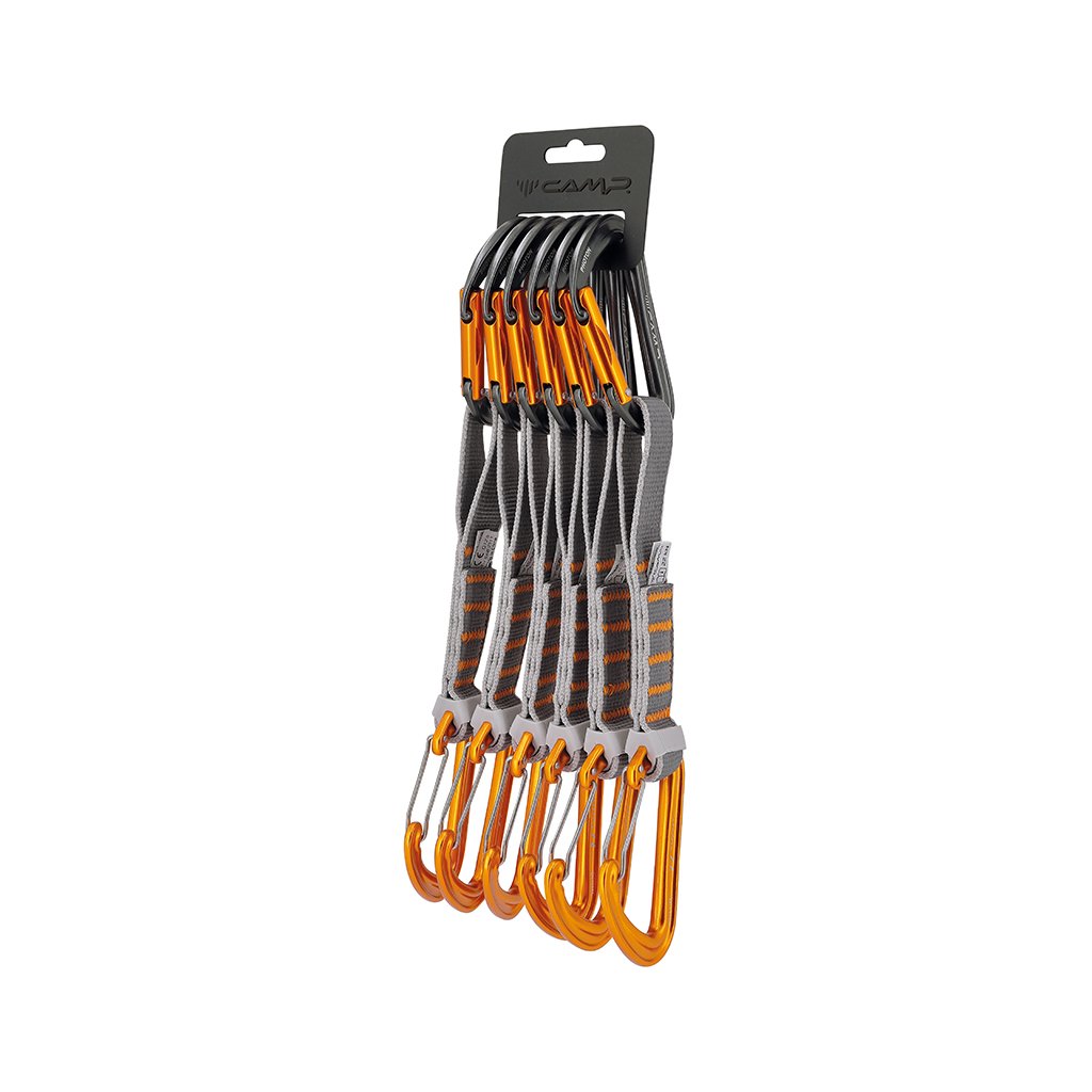 Sada 6ks profesionálních mixových expresek CAMP Photon Mixed Express s ultralehkými plnými karabinami CAMP Photon Straight Gate s keylockem a CAMP Photon Wire. Karabiny jsou spojeny širokou polyesterovou 18cm smycí. Drátová karabina CAMP Photon Wire je nejlehčí karabinou v plné velikosti, kterou CAMP nabízí. Karabiny CAMP Photon Straight Gate jsou vylepšeny o patentovanou úpravu SphereLock, která přesným výbrusem nosu a zámku karabiny ještě zvyšuje pevnost při zatížení. Další vychytávkou je doplněk Karstop Evo, který zamezuje protáčení karabiny, kterou vede lano. Barevné zvýraznění karabin je navrženo pro maximální přehled, orientaci a kontrolu v terénu.
