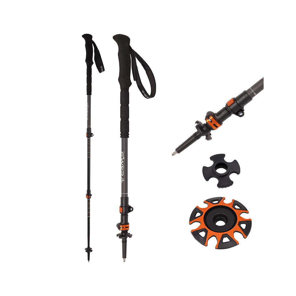 Backcountry Pro 2 jsou velmi lehké 3-dílné teleskopické trekkingové hole. Vyváženost pevnosti a hmotnosti zajišťuje zvolený materiál jednotlivých segmentů: Horní segment z vláken karbonu poskytuje požadovanou tuhost a spodní 2 segmenty z hliníkové slitiny (7075) plní funkci maximální absorbce nárazů. Ergonomicky tvarovaná poutka pro levou a pravou ruku spolu s ergonomickými madly poskytují maximální pohodlí úchopu a efektivitu při záběru. Prodloužené madlo vám zajistí další možnosti úchopu (v traverzu prudkého svahu). Teleskopické segmenty jsou zajištěny pevnými zámkovými klipy, které umožňují velice snadné a rychlé nastavení délky hole od 100 do 135cm (63cm je složený stav). Karbidový hrot zaručuje dlouhou životnost a bezpečnost při kontaktu s různými povrchy. Hole CAMP Backcountry Pro 2 můžete díky 2 velikostem košíčků, které jsou součástí, využívat na všechny outdoorové aktivity pro celý rok.