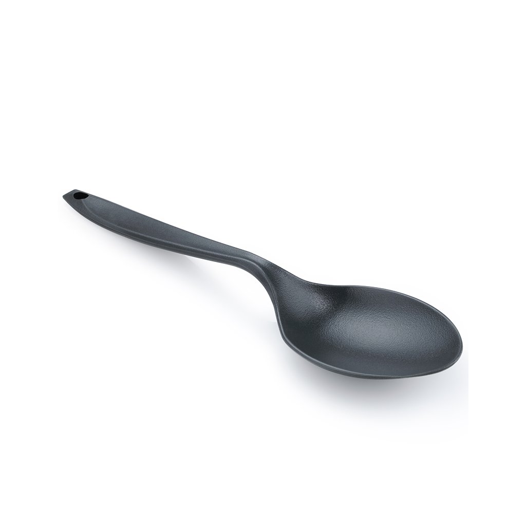 Polévková lžíce vyrobena z velmi odolného plastu Acetal. Na konci rukojeti je otvor pro snadné zavěšení.