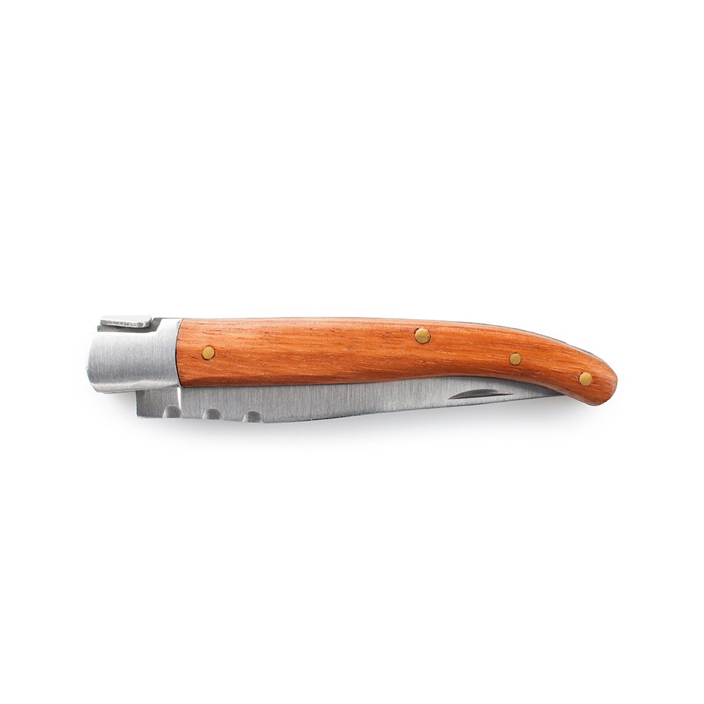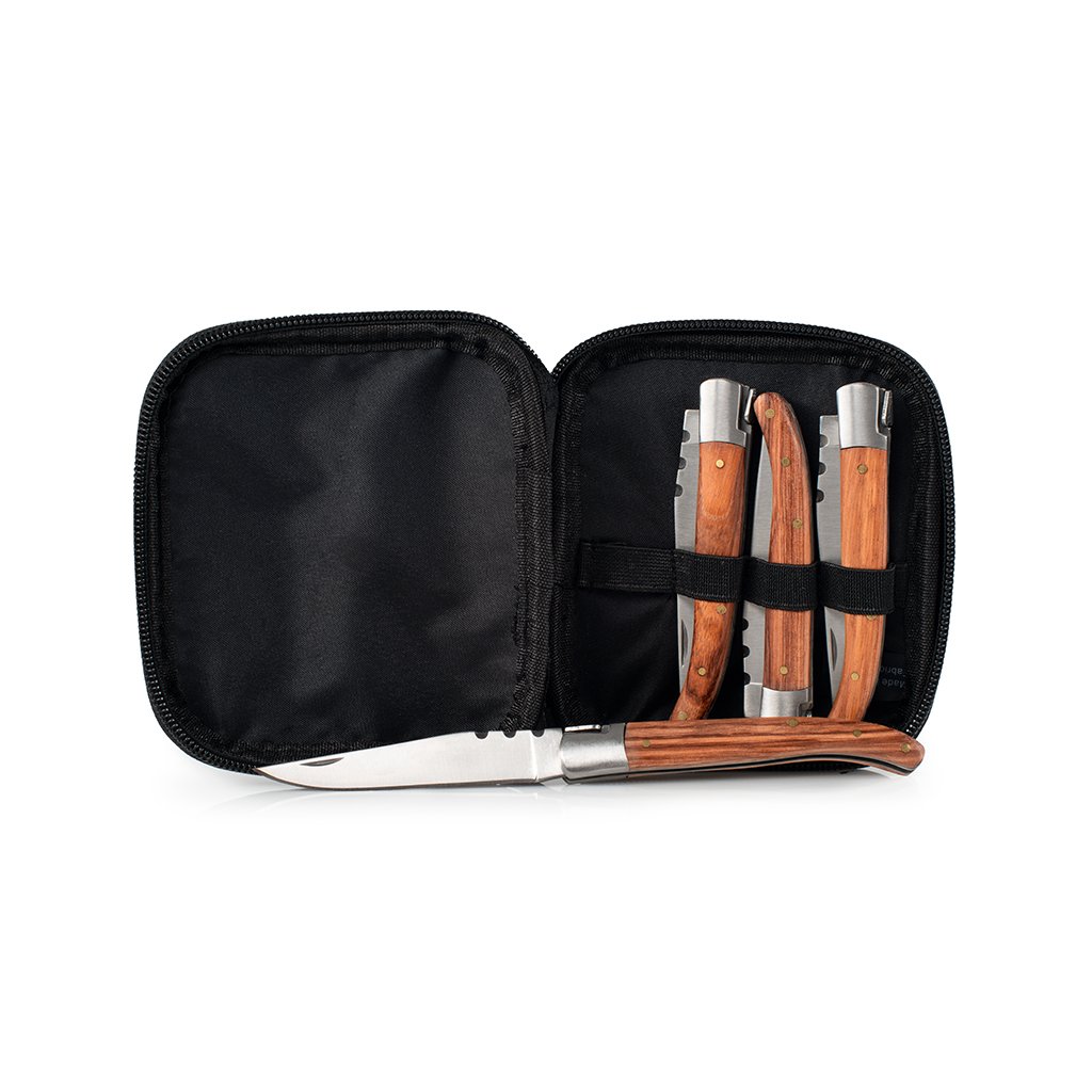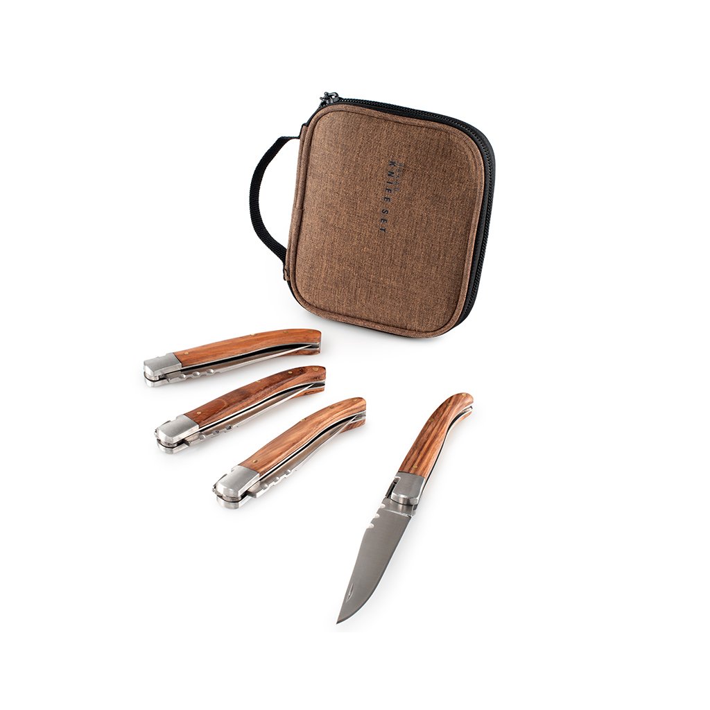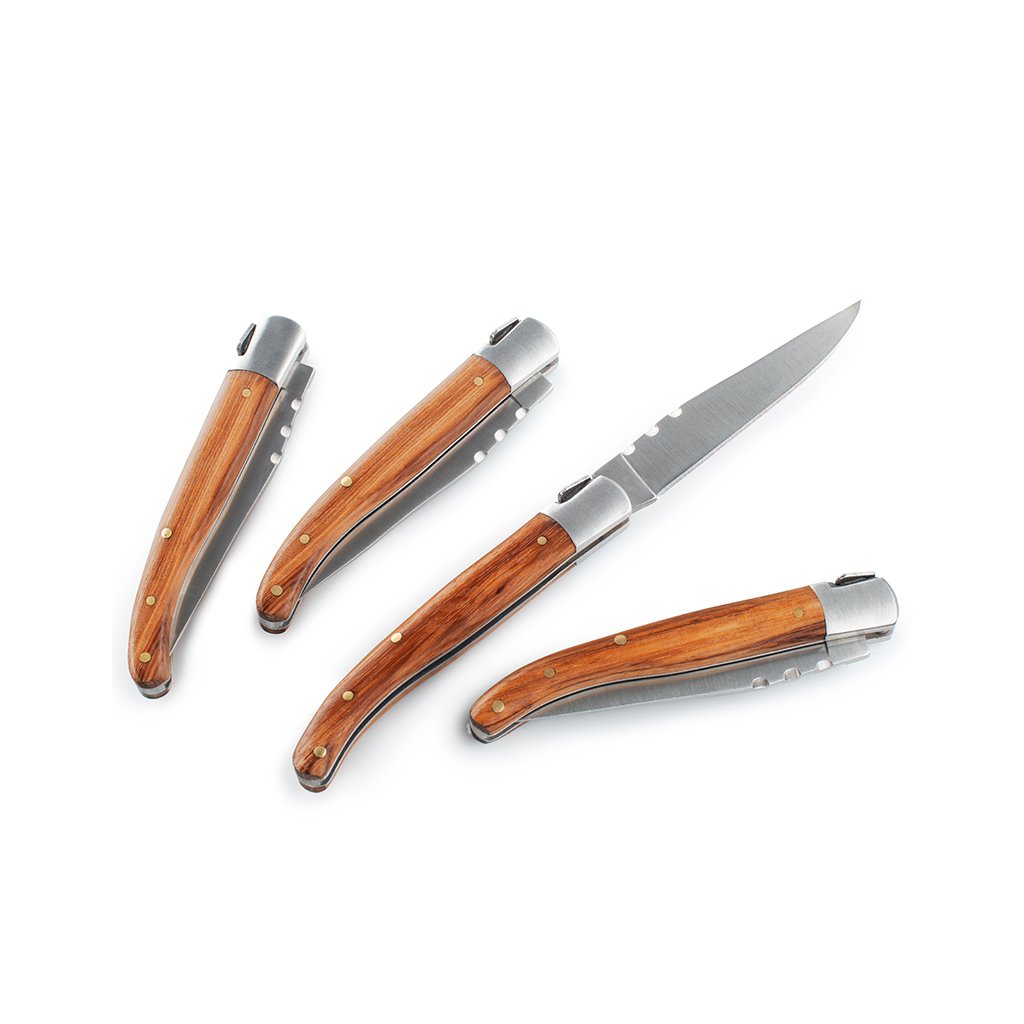 Sada 4 steakových zavíracích nožů Folding Steak Knife je dalším produktem z kolekce Rakau americké značky GSI Outdoors. Ostří nožů je vyrobeno z prvotřídní nerezové oceli, která vyniká výjimečnou tvrdostí a kvalitou. Tvarovaná střenka každého z nožů je stejně jako ostatní produkty rodiny Rakau vyrobena z recyklovaného dřeva, které je jednak příjemné na pohmat, ale hlavně v ruce neklouže. Celá sada je uložena v přepravním obalu z recyklovaného PET