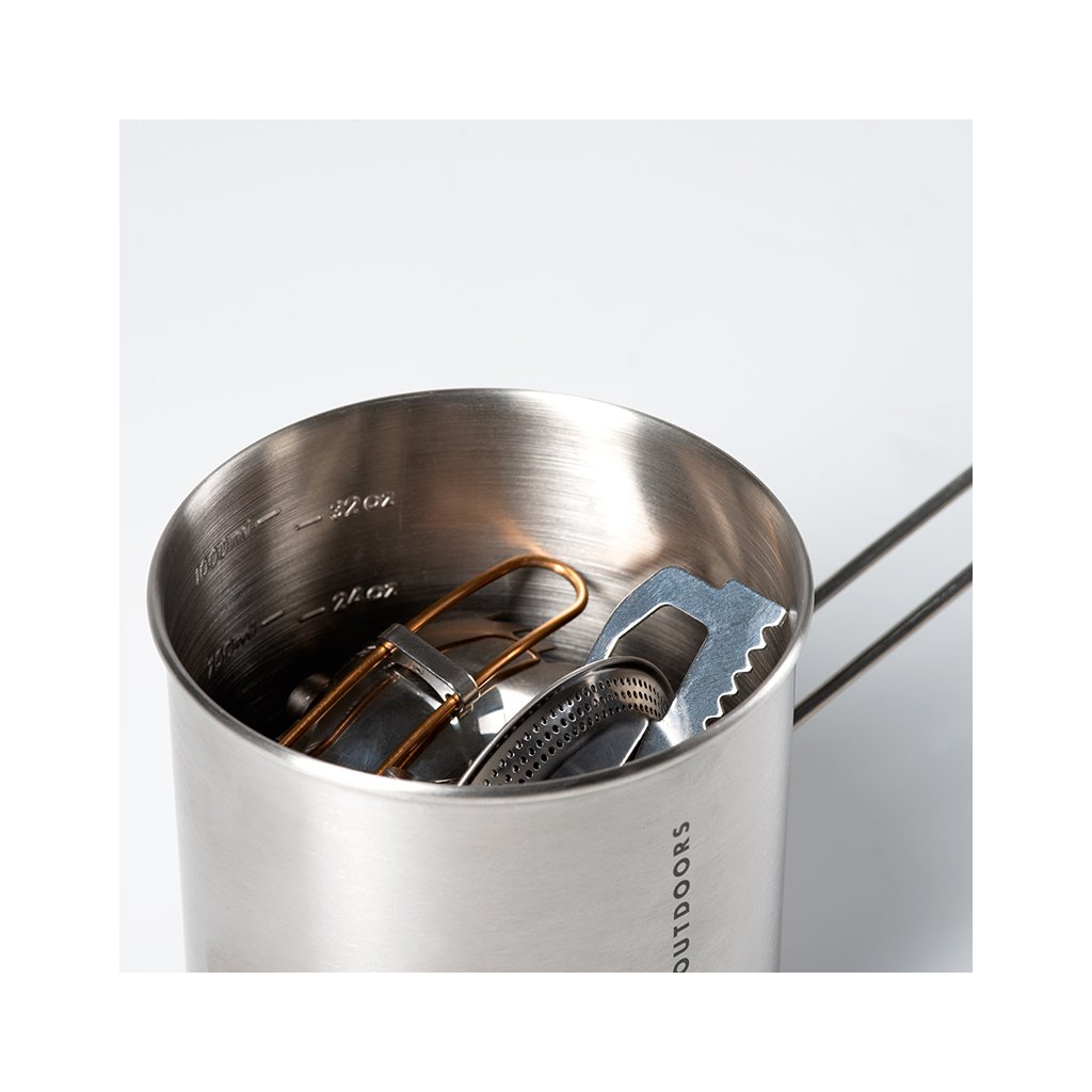 et 1,1l kotlíku GSI Glacier Stainless Boiler, vařiče GSI Glacier Camp Stove a multifunkčního příboru GSI Glacier Folding spork, vše z prvotřídní nerezové oceli 18/8 Stainless Steel (304). Celý set se dá do hlavního kotlíku složit tak šikovně, že zbyde místo i pro plynovou kartuši GSI Isobutane Fuel 230g, která však není součástí. Mezi přední vlastnosti setu rozhodně patří vysoká mechanická odolnost a životnost použité nerezové oceli. Kotlík se sklápěcí rukojetí má vyraženou vnitřní stupnici objemu, tedy jednoduše odměříte potřebné množství vody pro zalití třeba lyofilizované stravy. Plynový vařič GSI Glacier Camp Stove nabízí výkon 12970 BTU/h (3,8kW), dostatečně širokou plochu ramen 125 mm (pro GSI hrnce z řady pro 1 i 2 osoby) a k tomu regulační ventil s jemným nastavením plamene.