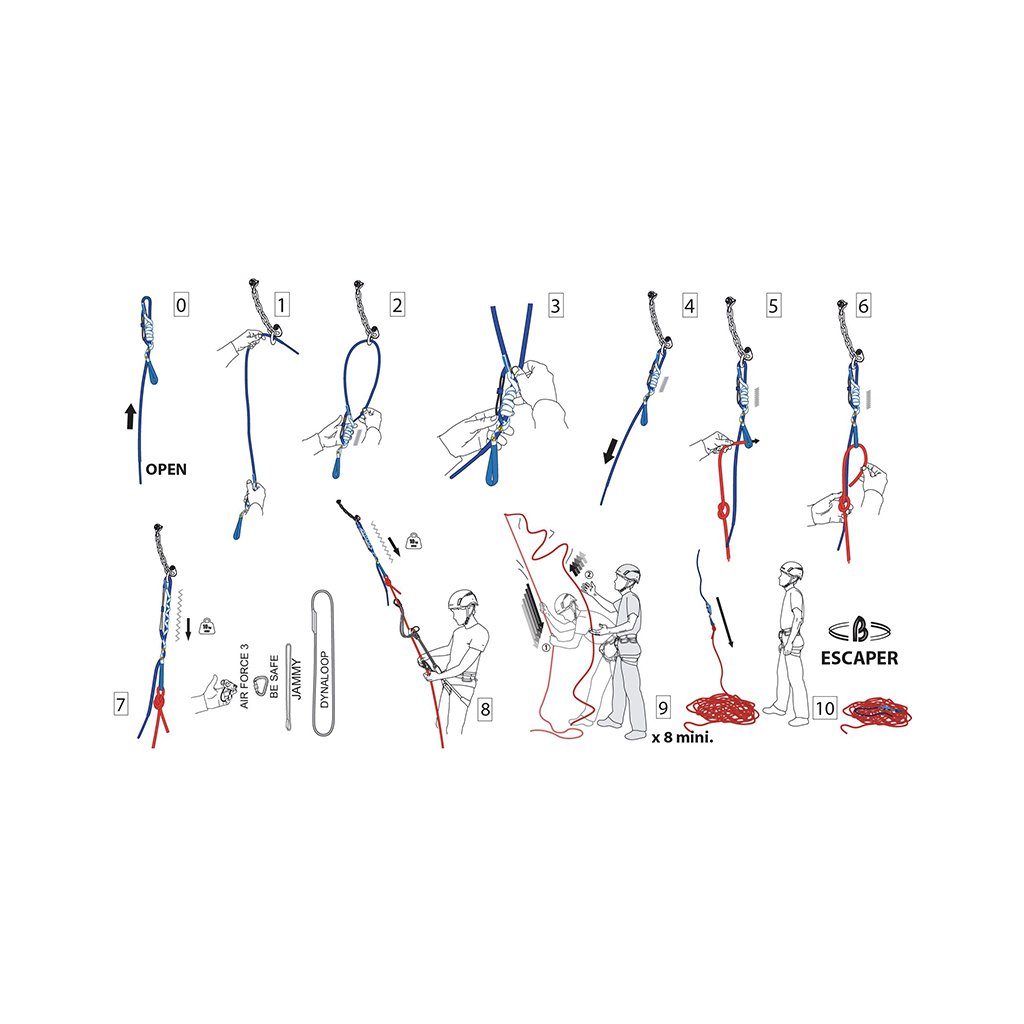 BEAL Escaper je patentovaná speciální pomůcka, která zajišťuje ten nejjednodušší způsob jak bezpečně a rychle slanit ze stěny po jednom prameni lana. Celý systém je založen na bázi prusíku, který pod zatížením (slaňováním) pevně drží konec lanovice Escaperu. Po slanění stačí pak 8-12x za lano silně zatáhnout a úplně povolit, čímž se prusík začne povolovat, až konec lanovice projede slaňovacím okem (nýtem) a spadne k vám i s navázaným koncem lana. Beal Escaper je certifikovaná modifikace způsobu, který se v praxi v úzké skupině lezců používal při nuceném rychlém ústupu z hory. Nezabere téměř žádné místo, skoro nic neváží, všechny jeho části jsou vizuálně snadno kontrolovatelné. Správný postup zajištění je dokonale nakreslen přímo na odolném textilním obalu, ve kterém je Escaper dodáván. Escaper lze kombinovat se všemi typy lan od průměru 7,3mm (Beal Gully).