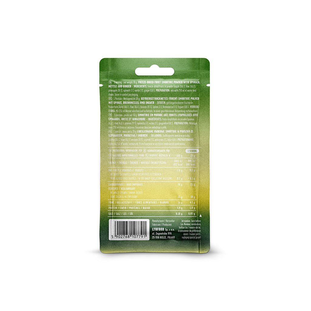 Špenát, kopřiva, jablko, kiwi a ananas se špetkou zázvoru… Toto není menu z nové moderní kavárny, ale naše nejprodávanější smoothie! Svou osvěžující chutí a zářivě zelenou barvou okouzlí LYO Green Smoothie vaše smysly. Užijte si ho po celý rok, ve městě, na cestách i při svých outdoorových dobrodružstvích.