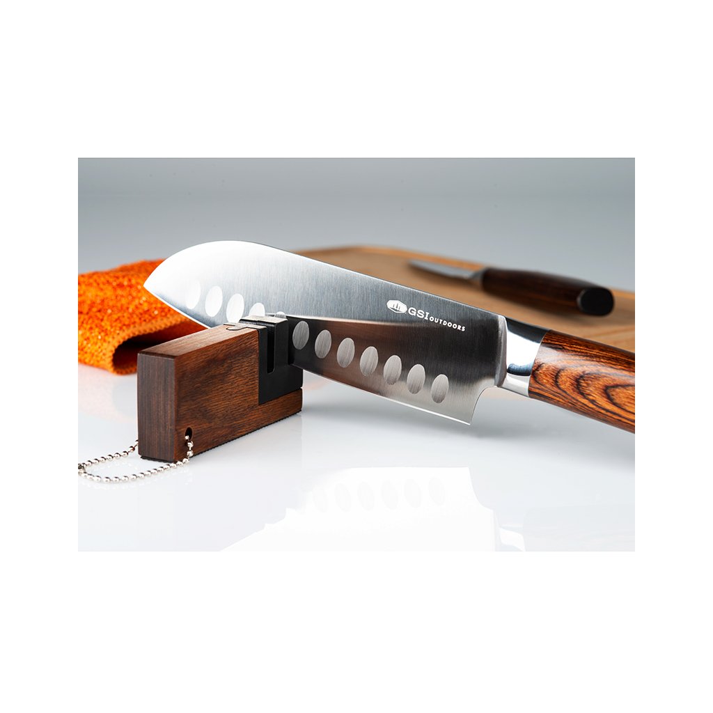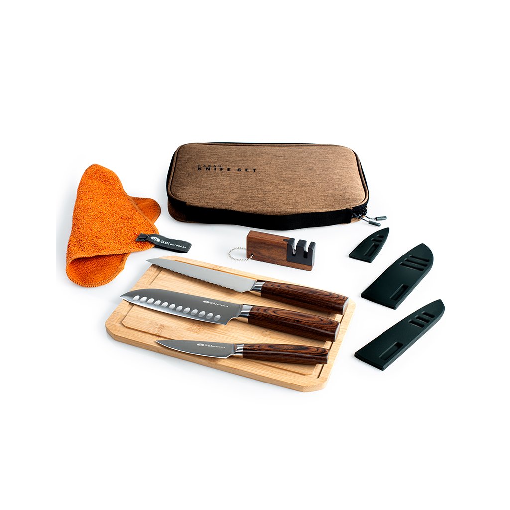 Kompaktní cestovní sada kvalitních nožů z nerezové oceli. Sada Rakau Knife set obsahuje tři nože: kuchařský nůž, menší kuchyňský nůž a zubatý nůž na pečivo. Všechny nože mají rukojeť vyrobenou ze dřeva. V setu jsou potřebné doplňky na péči o nože a bambusové prkýnko s obvodovým kanálkem pro zachycení šťáv z masa nebo zeleniny.