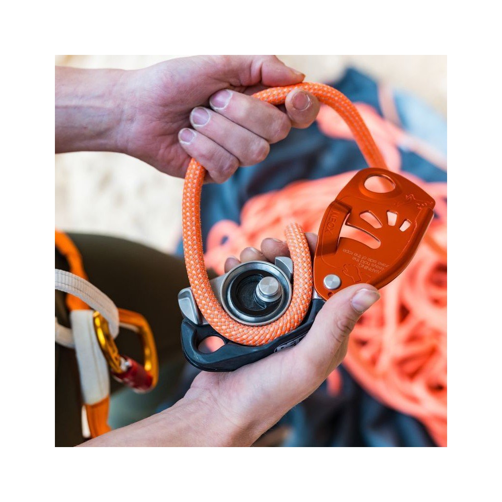 - Nedoporučujeme pro začínající lezce, není to samoblokovací zařízení, neustále je nutné držet volný konec lana v ruce