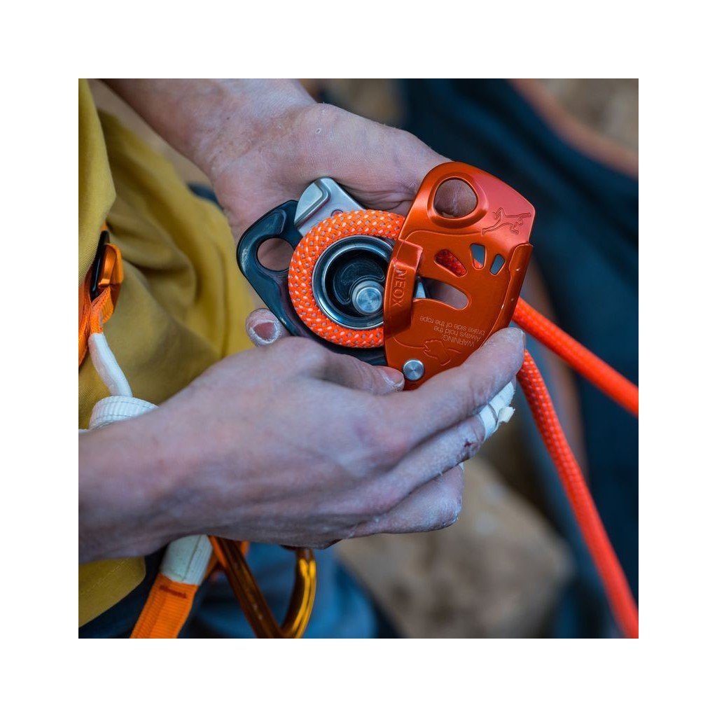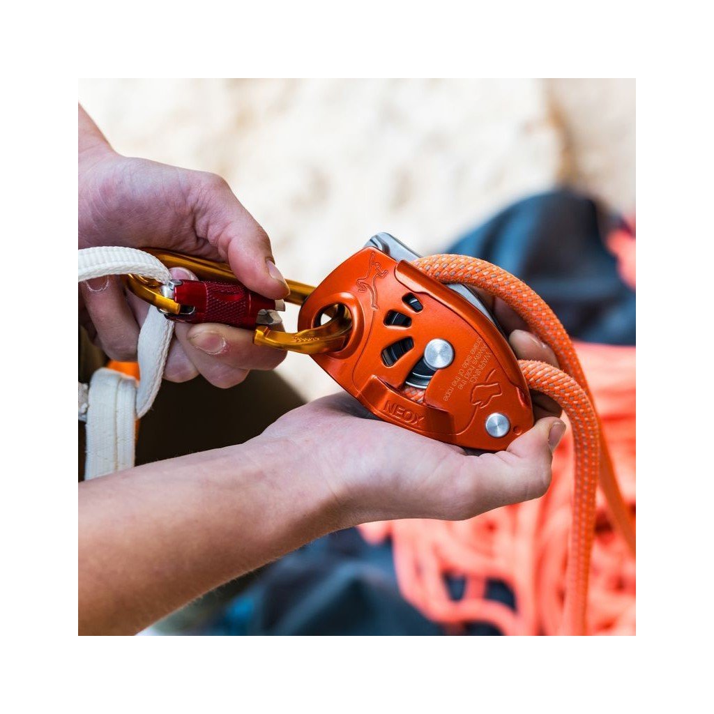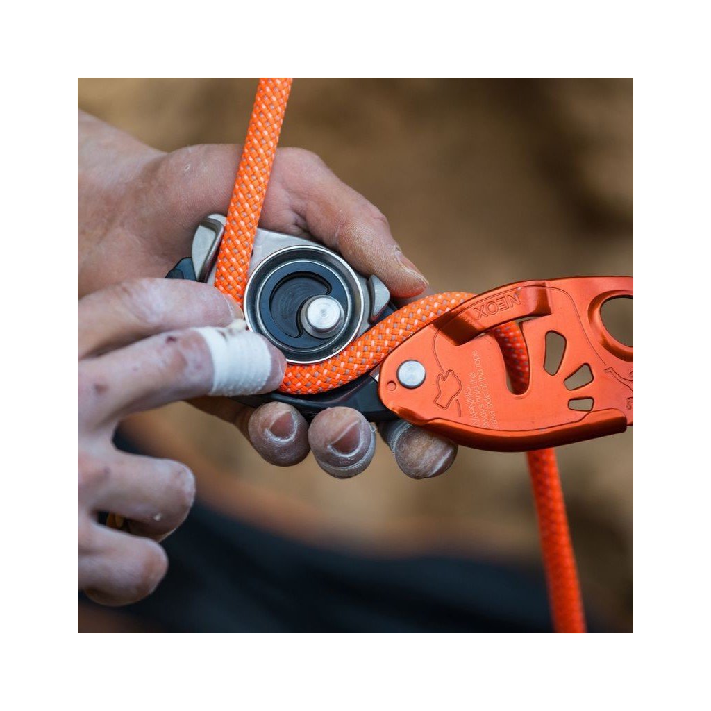 - Petzl NEOX není samoblokovací zařízení, proto je nezbytné neustále držet volný konec lana v ruce. NEOX je konstruován speciálně pro rychlé a hladké podávání lana, stisk ruky na volném konci lana určuje jeho fungování