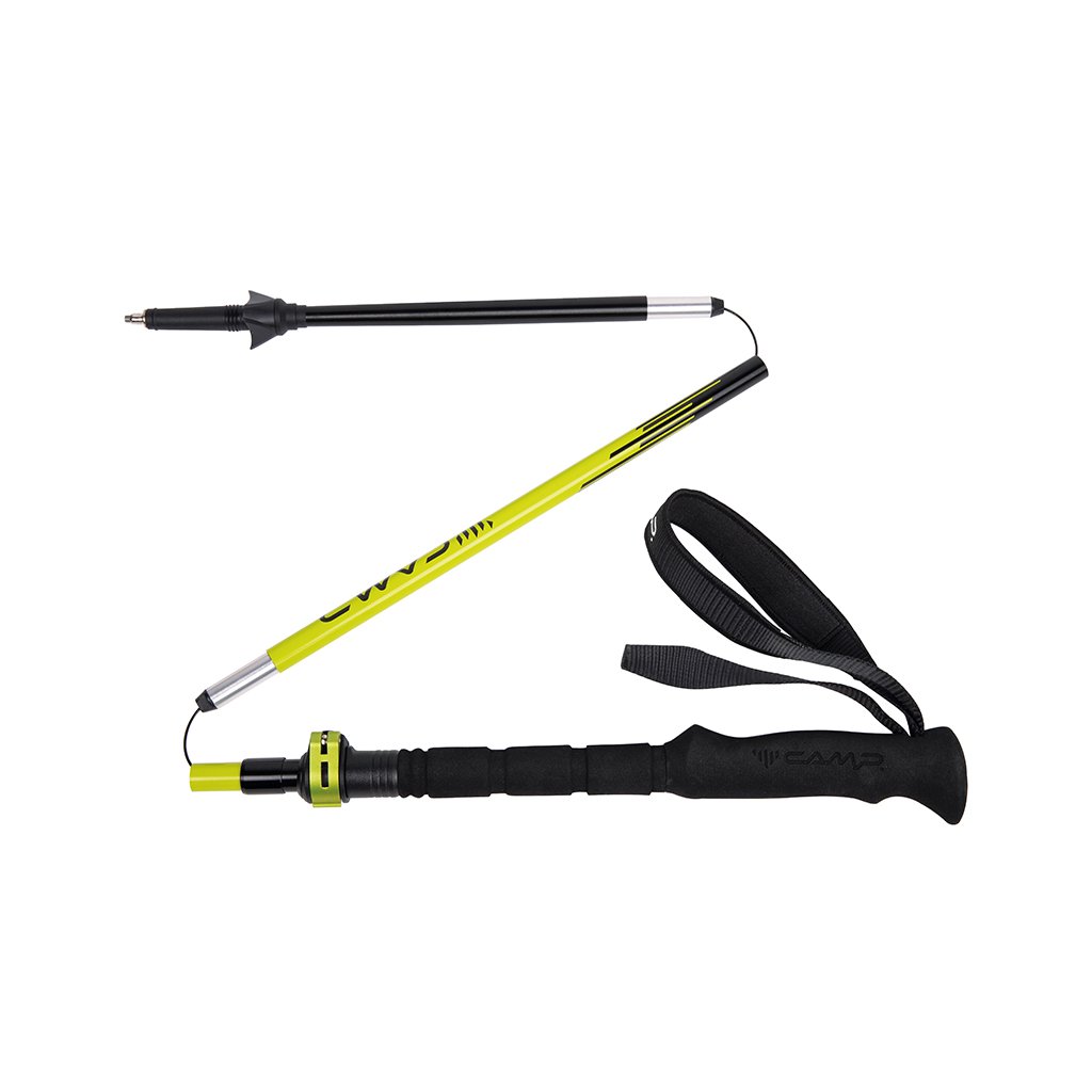 The C.A.M.P. Megasonic Plus folding poles use thicker segment diameters for increased durability and stiffness. A total of 5 segments made of aluminum alloy are connected by an internal 1.5 mm steel cable with a polyamide sheath, allowing you to easily adjust the pole’s stiffness. For more versatile use, the top ergonomically shaped foam grips are extended, which is especially helpful in uneven terrain. The upper segment features the simple Alu Fast Lock system for easy length adjustment from 115 to 135 cm. A major advantage of the Megasonic Plus poles is their compact folded length of 36 cm, making them easy to stow in a backpack side pocket. The Megasonic Plus poles come with 3 basket sizes for different conditions, a rubber tip protector for the highly durable carbide tip, and a carry bag.