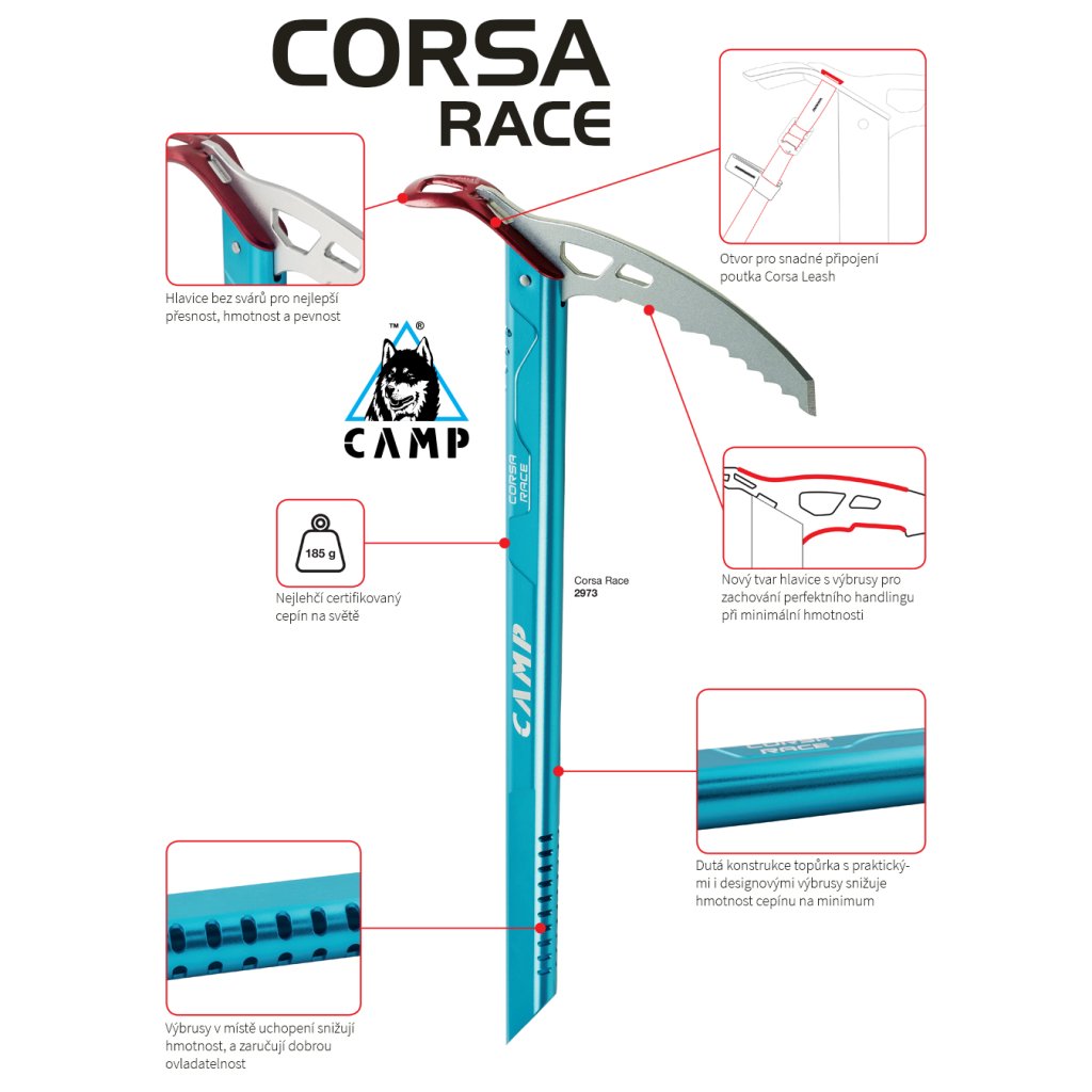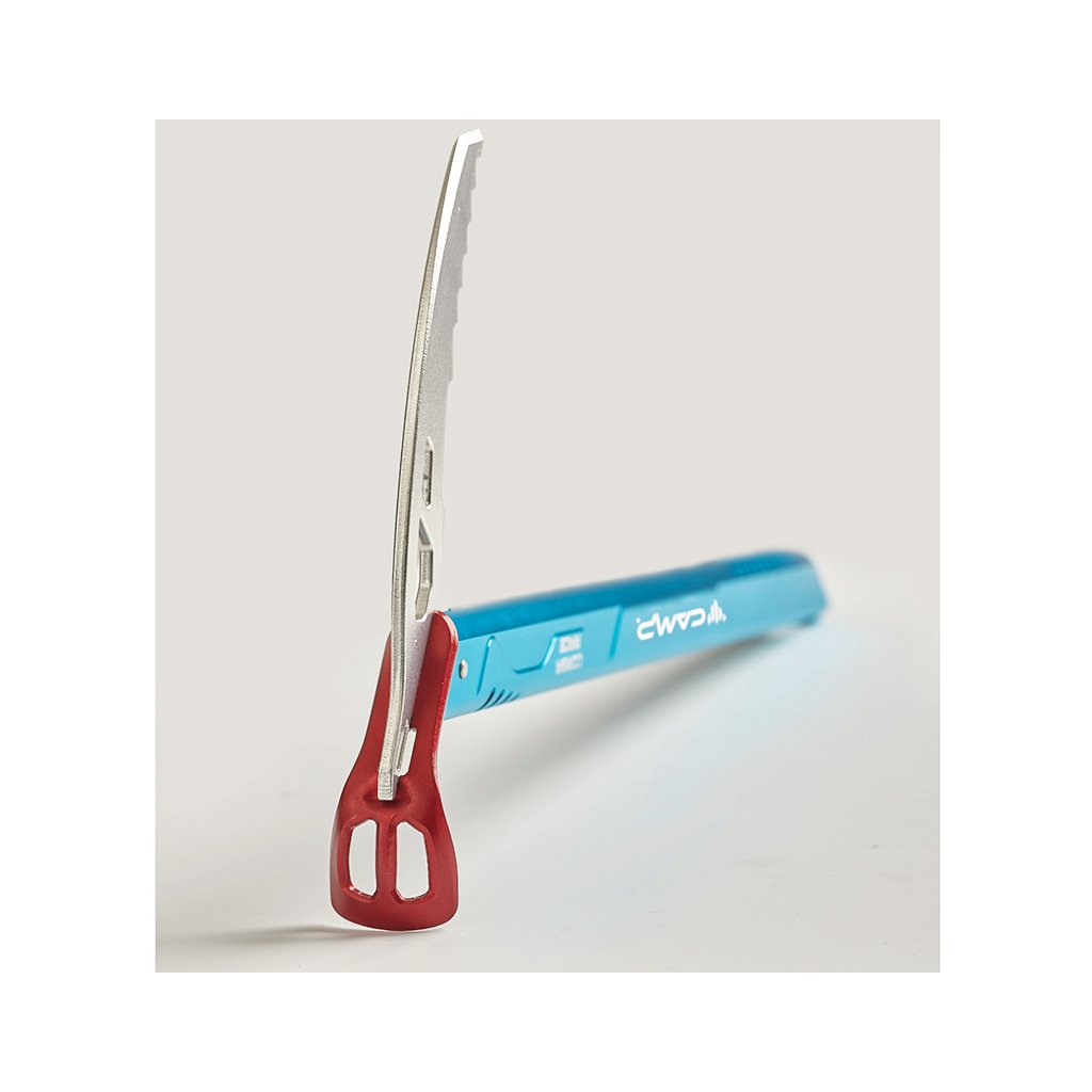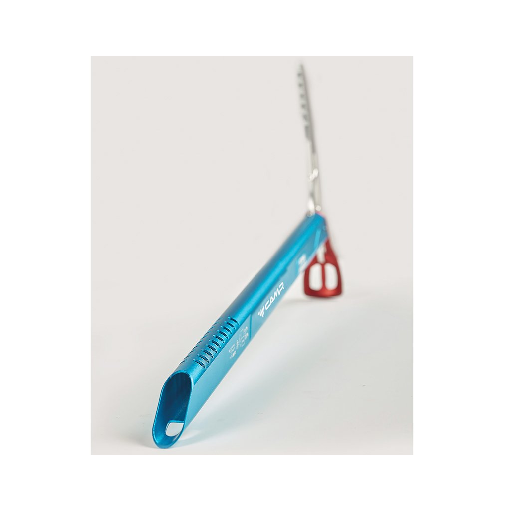Are you an ambitious racing ski alpinist looking for a functionality-to-weight ratio and you like to take your hikes lightly at speed? With its 185 grams, the CAMP Corsa RACE is currently the lightest certified ice ax in the world, which must not be missing from your mandatory equipment. The ice ax is specially designed for competitive ski mountaineering, where the emphasis is on the lowest possible weight of mandatory equipment. You won't even feel it on your back during the race, and it will give you the support you need in action. The invented concept of the whole head enables a new way of connecting the loop CAMP Corsa Leash and thanks to its special shape and finish Corsa RACE maintains perfect handling. Machine grinding in the gripping points works against slippage. It is made of an aluminum alloy that meets all CE and UIAA requirements for strength and durability. The lower part of the ax is equipped with a nylon seal that prevents the accumulation of snow.