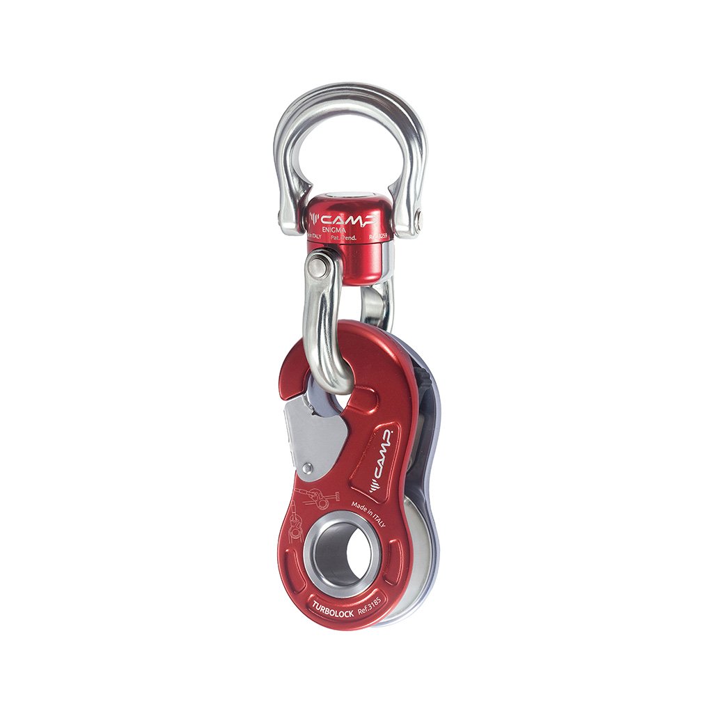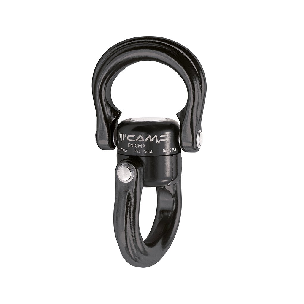 Enigma Black is a completely new rotating and opening swivel (coupling) that can be folded down and easily connected to both textile and metal material without the need for additional connecting material. The swivel joint, thanks to the combination with the hinged eyes, allows an incredible range of connection and interconnection options. The unique design also allows the swivel to be completely opened using one screw and the enclosed special key. The safety locking system is independent and against the direction of the work position for easy and safe assembly. The stainless steel core with ball bearings in combination with the body and the aluminum alloy eyes are a guarantee of high strength. The eyes have a large opening (18 mm) and a large internal working space for connecting several other devices.