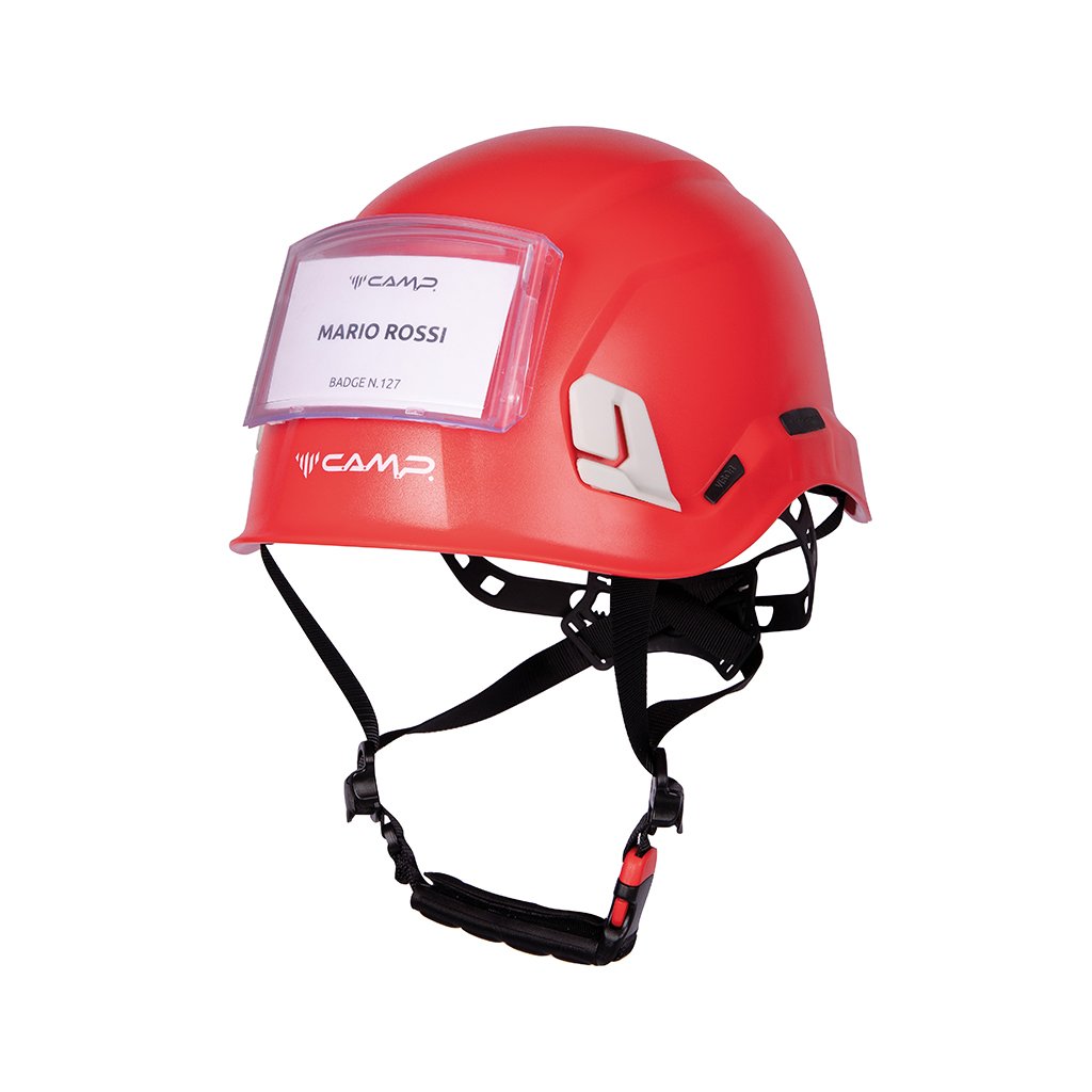 Transparent clip for attaching a name tag or identification label to a work helmet. Thanks to the strong double-sided tape, the clip is compatible with all C.A.M.P. helmets.