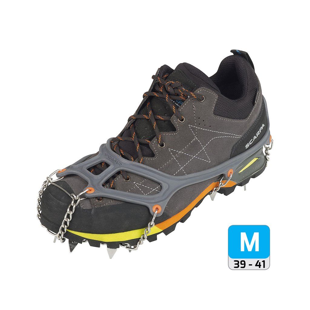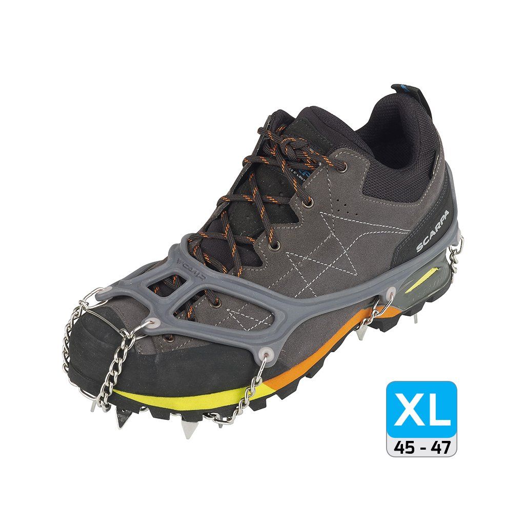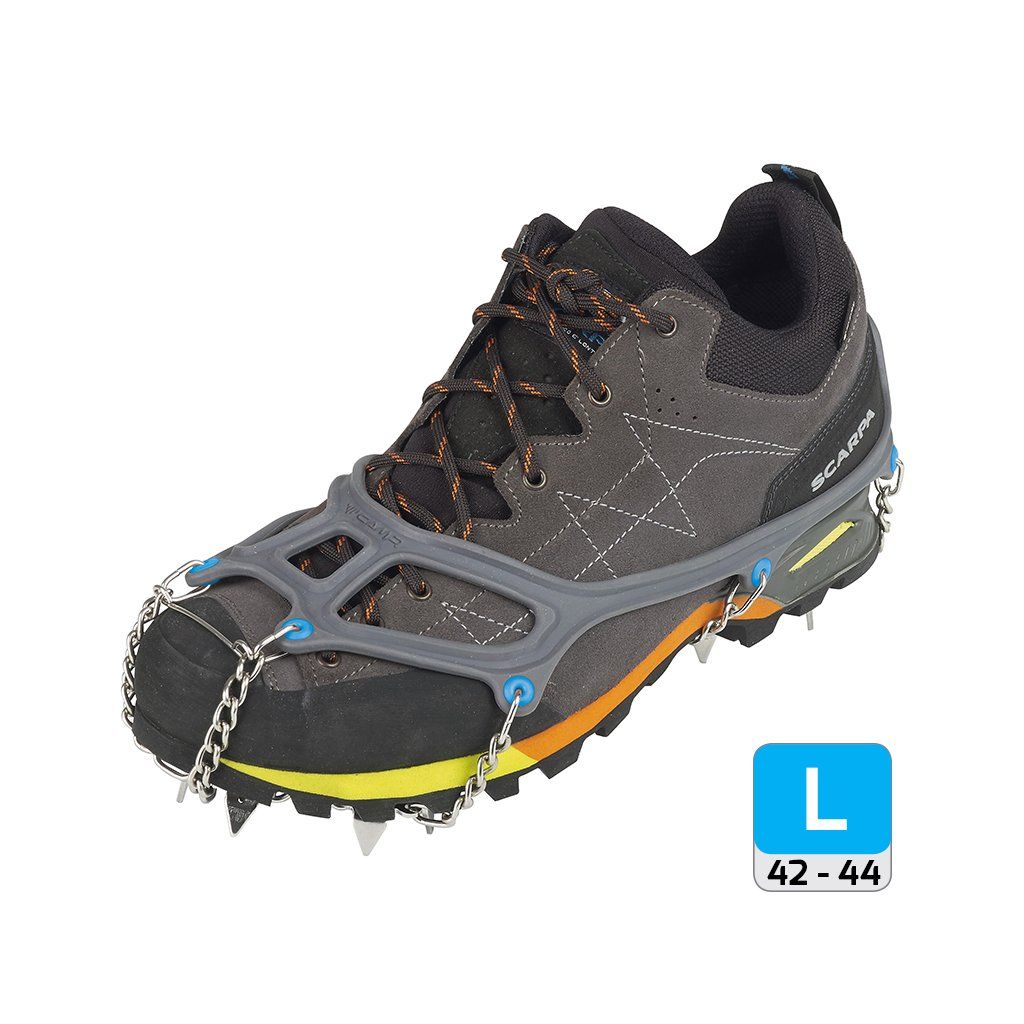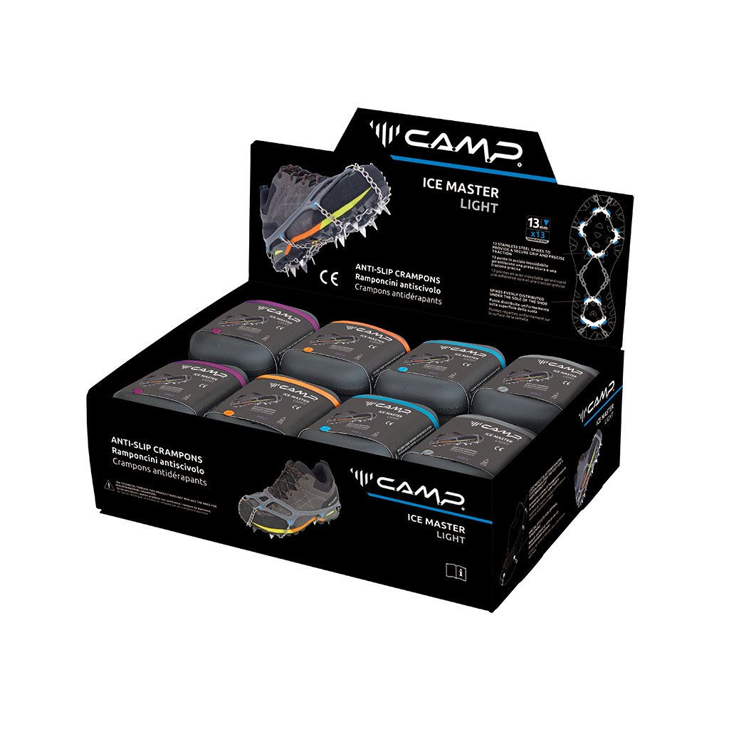 Ice Master Light are super light crampons with 13 13 mm stainless steel spikes for safe and comfortable walking on icy terrain. Not only is this new version lighter (it weighs only 270g), it is also more compact. The even distribution of the tips guarantees maximum efficiency when in contact with snowy, icy or slippery surfaces. The innovative attachment to the shoe is ensured by means of a flexible elastomer that perfectly surrounds the shoe (it is only necessary to choose the right size according to the shoe). You can easily put them on using the prepared loop on the heel. Ice Master Light boots are suitable for winter hiking and out-of-season walks where you may be surprised by ice. Ice Master Light are also suitable for low trekking shoes. in technical terrain they do not replace the function of crampons!.