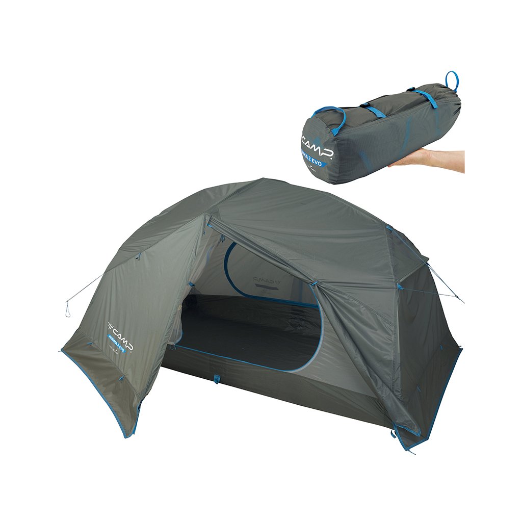 The Minima 2 EVO tent is a super light double-layer tent for 2 people, ideal for hiking and mountaineering. The leading advantages include the ultra-low weight - the set, including the poles, weighs 2.26 kg. The inner part ("bedroom") with 2 entrances is made of extra breathable mesh. It can be easily attached to the rod structure using clips. The bottom of the tent is made of high-strength waterproof material 70D Nylon 190T/N. The entire outer shell of the CAMP Minima 2 Evo tent is made of light but strong and water-resistant Nylon Ripstop 30D with taped seams. You can easily attach the jacket to the rod structure using Velcro fasteners. In the equipment of the tent, you will certainly appreciate 2 vestibules, 2 ceiling vents (with the option of closing), anti-directional zippers, internal storage pockets or a large vestibule. The tent includes 15cm long "V" shaped aluminum pegs for the best compromise between weight and strength.