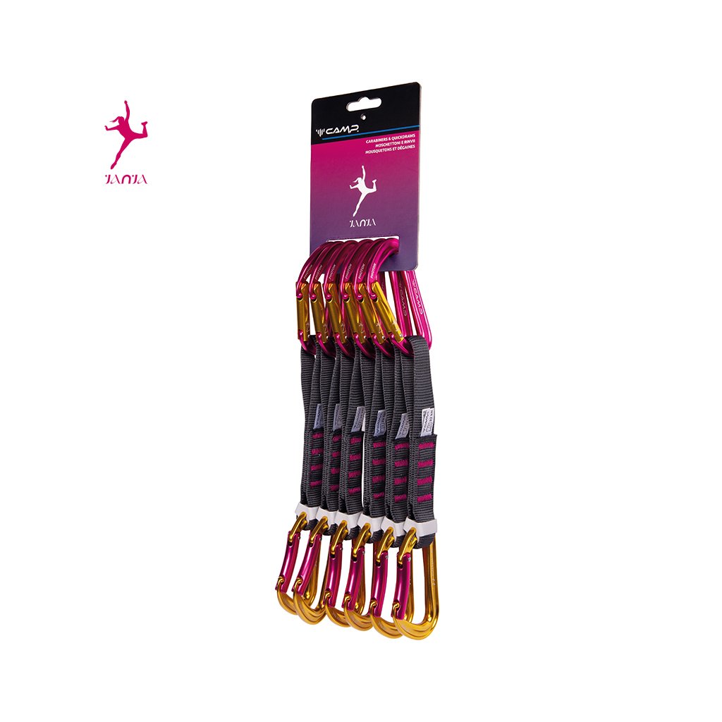 The set of 6 pcs of extended premium C.A.M.P. Photon Express KS Janja expresses belongs to the unique Janja Garnbret design collection. This set of expresses with ultra-lightweight full keylock carabiners C.A.M.P. Photon Straight Gate and C.A.M.P. Photon Bent Gate is part of the equipment that Janja - a double Olympic champion - has adopted after more than 10 years of cooperation with the C.A.M.P. brand. Janja is the greatest climbing icon who has inspired millions of young people around the world with her performance and personality. The Photon express set fits exactly the needs of beginners and more experienced climbers who want to pursue a wider range of climbing disciplines. C.A.M.P. Photon carabiners are enhanced with the patented SphereLock treatment , which adds even more strength under load by precision cutting the nose and lock of the carabiner. An important part of the expresso is the Karstop Evo accessory , which prevents the carabiner from twisting through the rope.