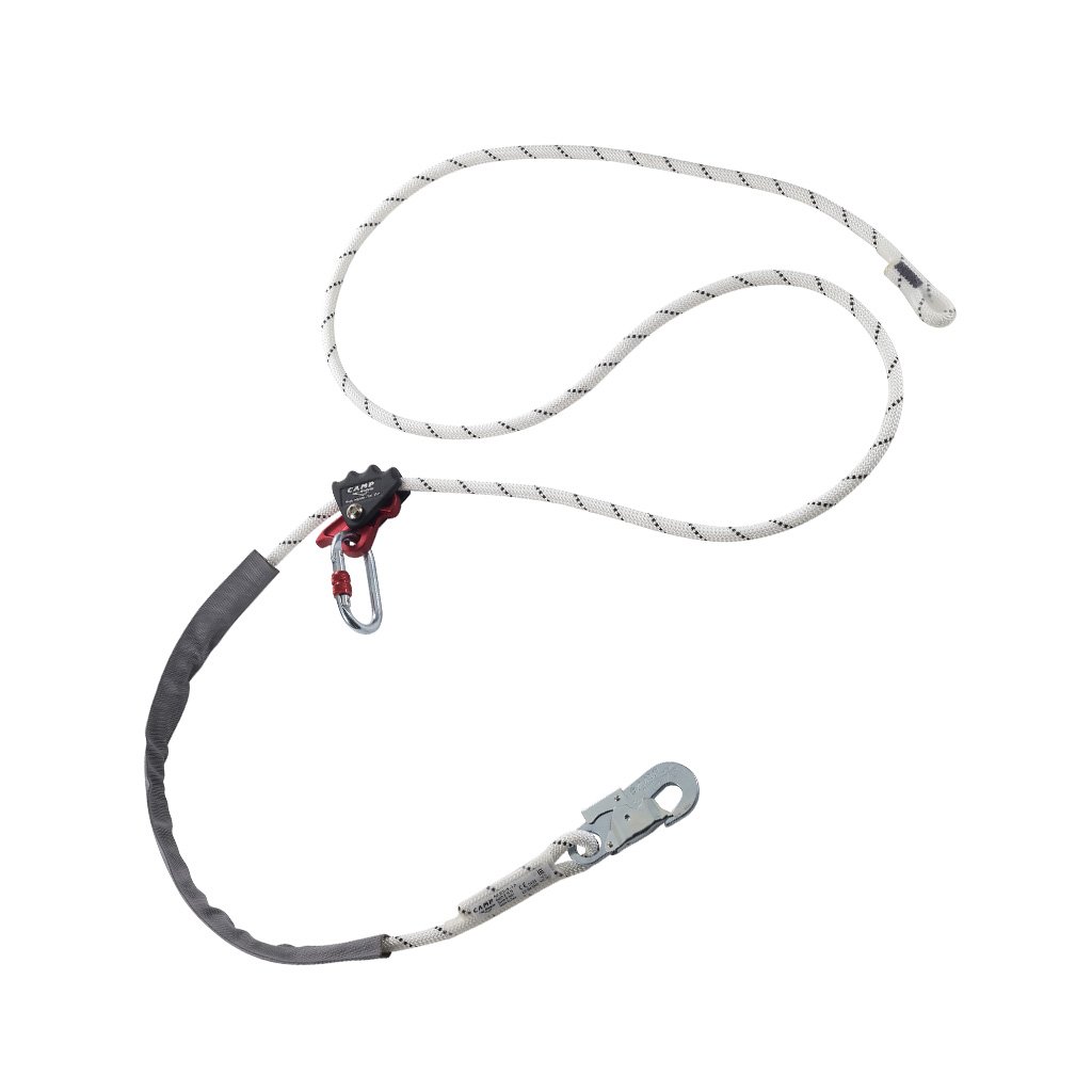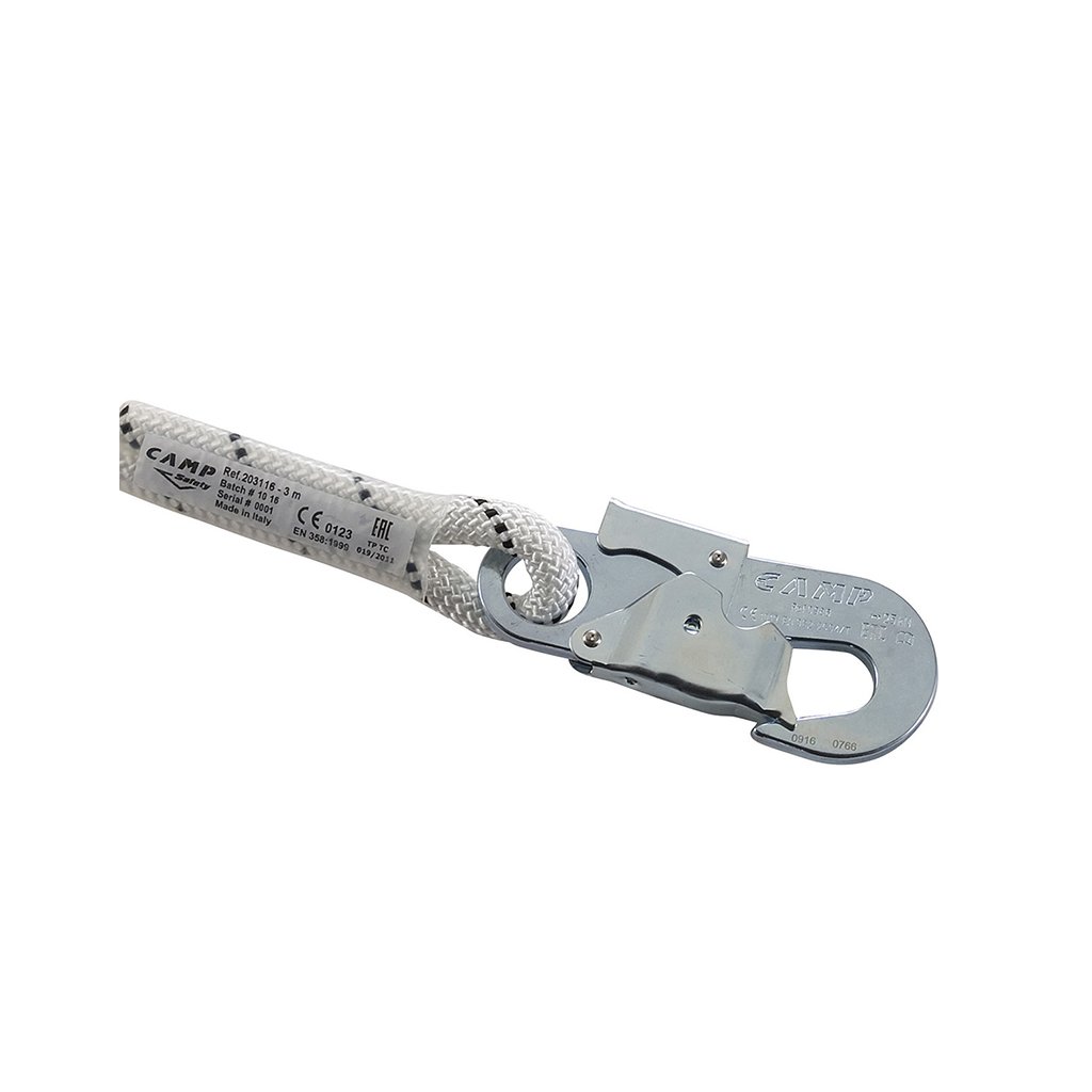 Positioning lanyard with sewn-in loops, made of 12.5 mm static polyamide rope. The working positioning length of the lanyard is 0.5m to 2m. Thanks to its ergonomic design, the self-locking positioning Rope Adjuster fits exactly in the hand and enables very easy operation. A steel carabiner CAMP Steel Oval Standard Lock  is used to connect to the harness ; and for securing itself, the lanyard is armed with a CAMP Hook 18mm connector.