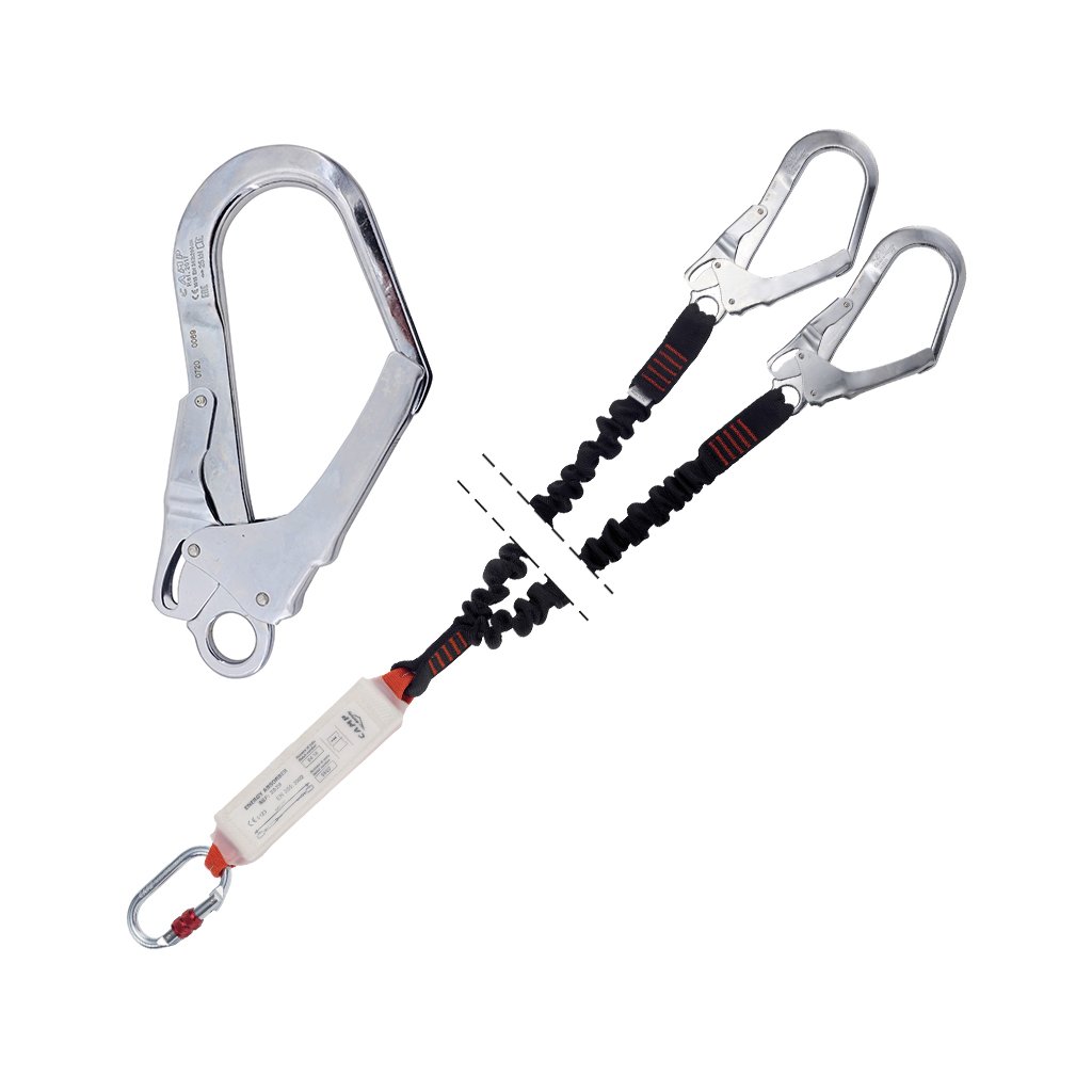 Camp shock absorber set CAMP Shock Absorber and two 32mm wide polyamide elastic straps , finished with palm hooks CAMP Steel Hook with a width of 53 mm. The steel oval screw carabiner CAMP Steel Oval Standard serves as the connecting carabiner to the full-body harness. Lock. The total length of the set including the carabiner and hooks is 120-175cm.