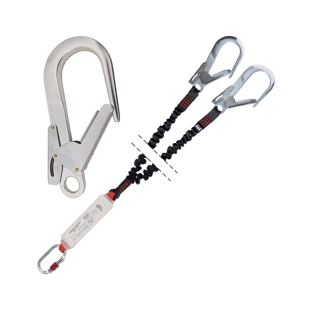 Camp shock absorber set CAMP Shock Absorber and two 32mm wide polyamide elastic straps , finished with aluminum palm hooks CAMP Alu Hook with a width of 60 mm. The steel oval screw carabiner CAMP Steel Oval Standard serves as the connecting carabiner to the full-body harness. Lock. The total length of the set including the carabiner and hooks is 120-175cm.