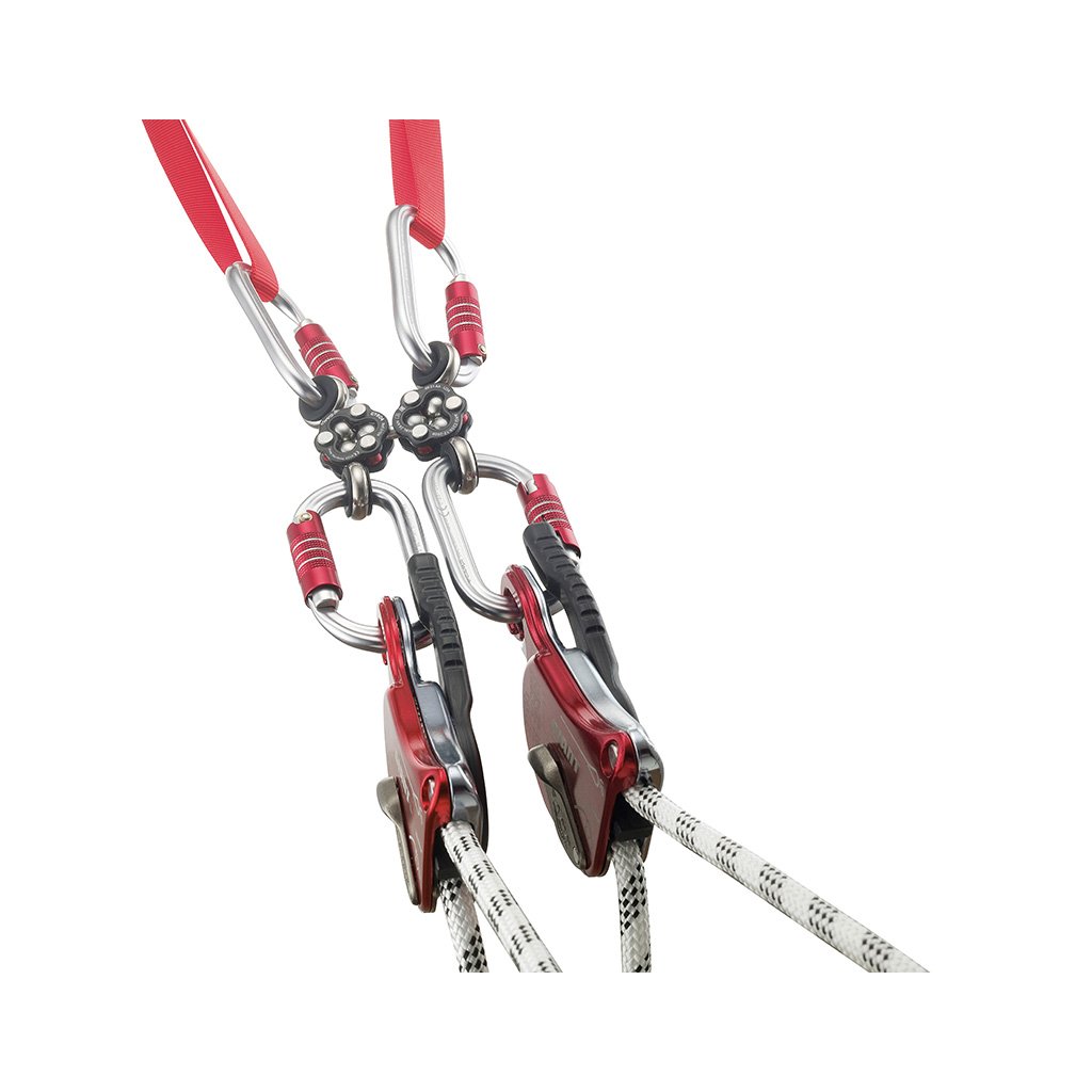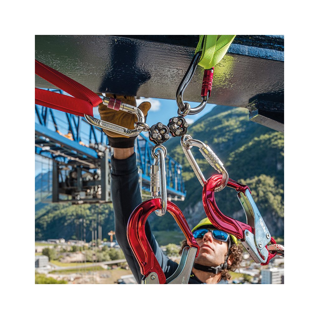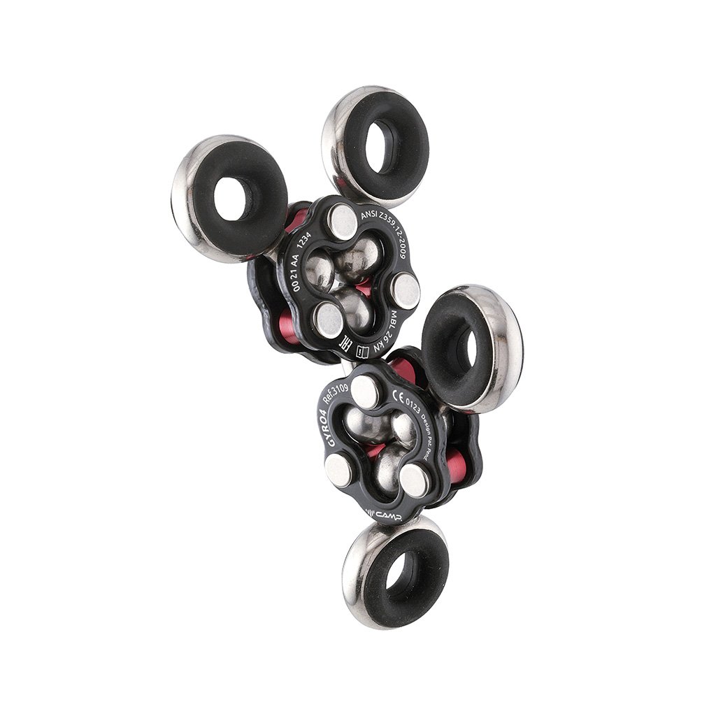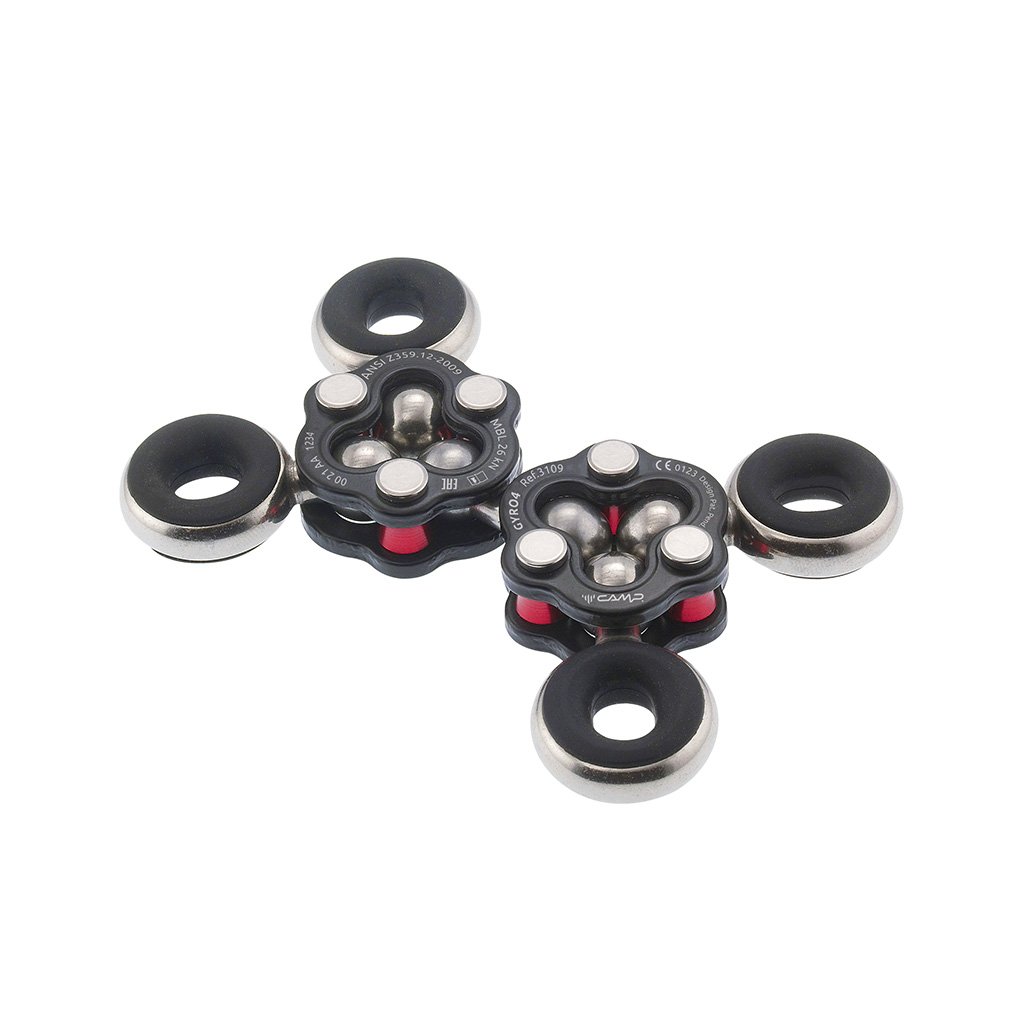 Compact universal swivel, which is unique with its four pivot points, which allow countless options for connecting different components. The CAMP GYRO4 swivel can be used by the user, for example, for multiple anchoring, multiple connections to a harness or when creating complex rescue procedures. The innovative design prevents the accumulation of dirt and facilitates inspection. The main structure is made of carbon steel with a double anti-corrosion coating, the swivel balls and fixing points are made of stainless steel. The product includes four removable silicone anti-rotation inserts.