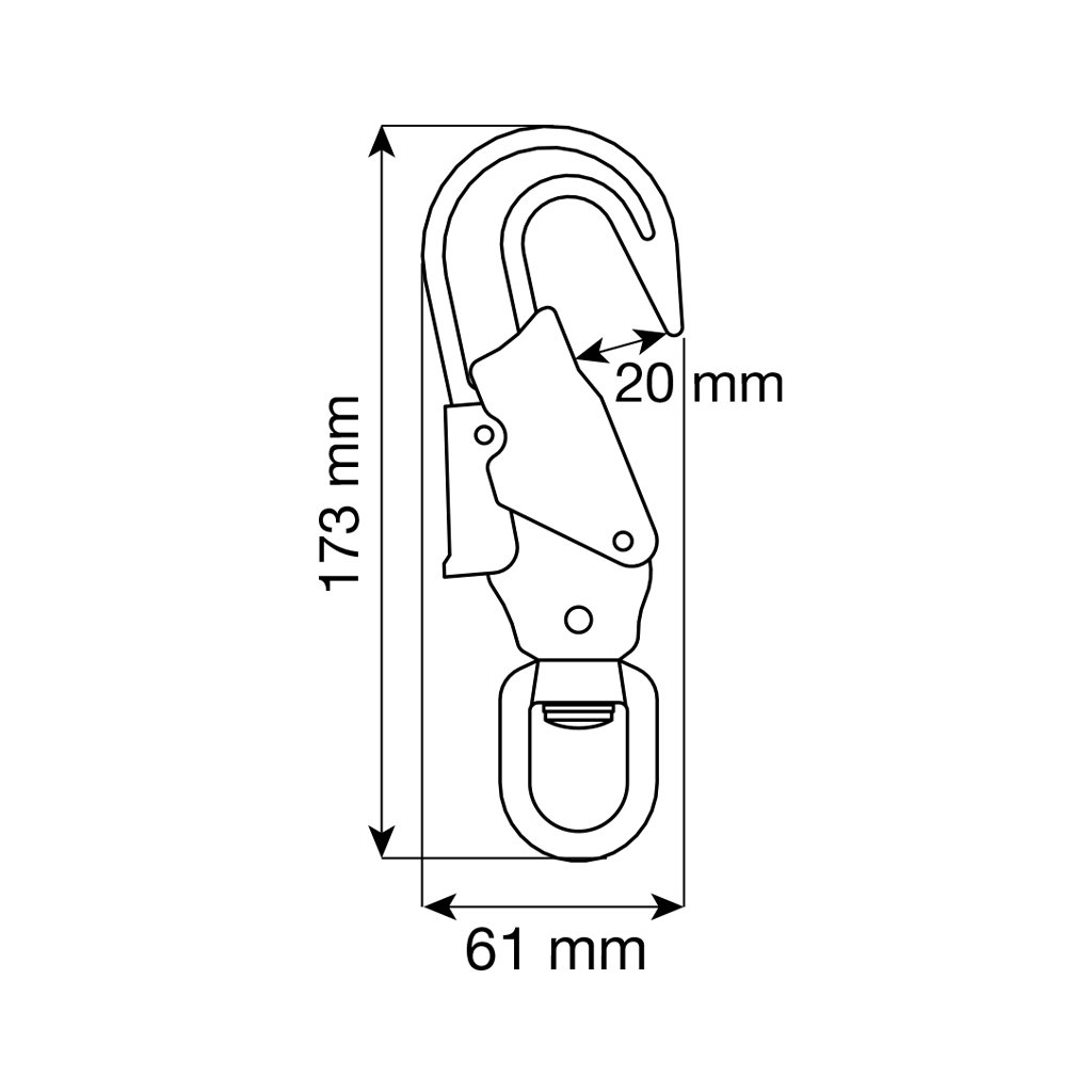 Steel securing hook with palm safety and swivel against twisting of rope or steel wire. The hook width is 20mm. The locking system with double palm safety ensures a high level of security and easy handling. The fall indicator is activated when the load is greater than 250kg.