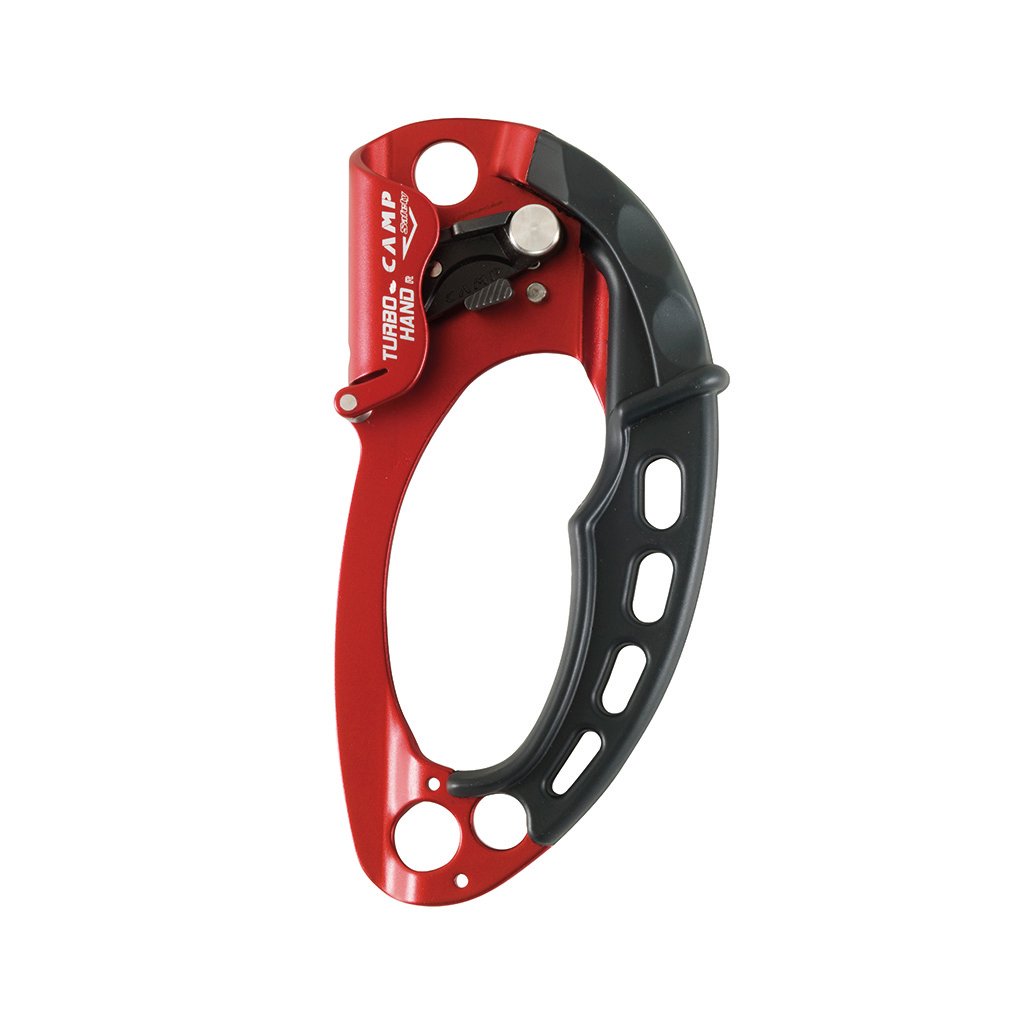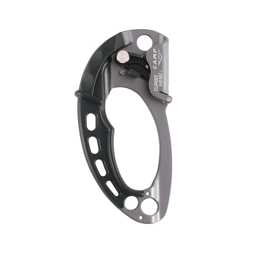 Turbohand is a manual blocker that facilitates rope ascent. It uses top technology and an innovative construction, thanks to which the ascent is safer, faster and, moreover, gentle on the rope. It uses a patented bell, which not only helps to move more smoothly along the rope, but also reduces friction and thus also the risk of damage to the rope. The ergonomic rubberized handle extends to the top of the blocker, making it very efficient to use the other hand to climb up. The CAMP Turbohand blocker is in a parallel position with the rope during ascent, which guarantees the best and most efficient ascent. Three large eyes, two on the bottom and one on the top of the blocker, are used for optimal organization of accessories. Blokant Turbohand is available in both right- and left-handed versions and is suitable for ropes from 8mm to 13mm. The robust body is made of 3.5mm thick aluminum alloy. The toothed cam has a special anti-wear surface treatment and is provided with holes to help prevent the accumulation of dirt. The opening system is protected against accidental opening from both sides. The presence of the bell also makes it possible to use the Turbohand as a blocking pulley with a load of up to 50 kg. CAUTION: This configuration does not allow the use of the blocker to pull or secure people. A steel guide (Turbohand Guide, sold separately) can be added with two screws to the bottom of the blocker for better rope stability during long ascents.