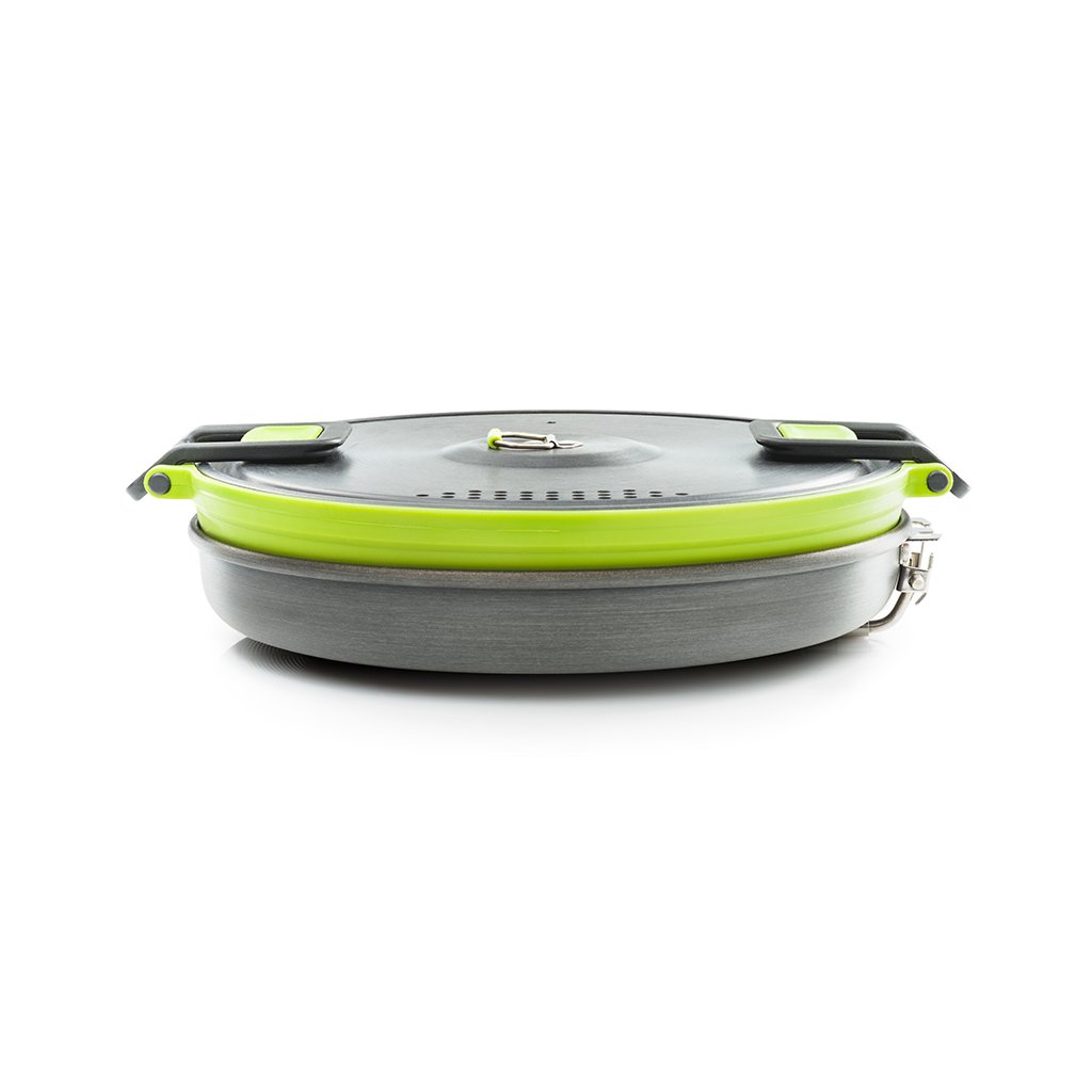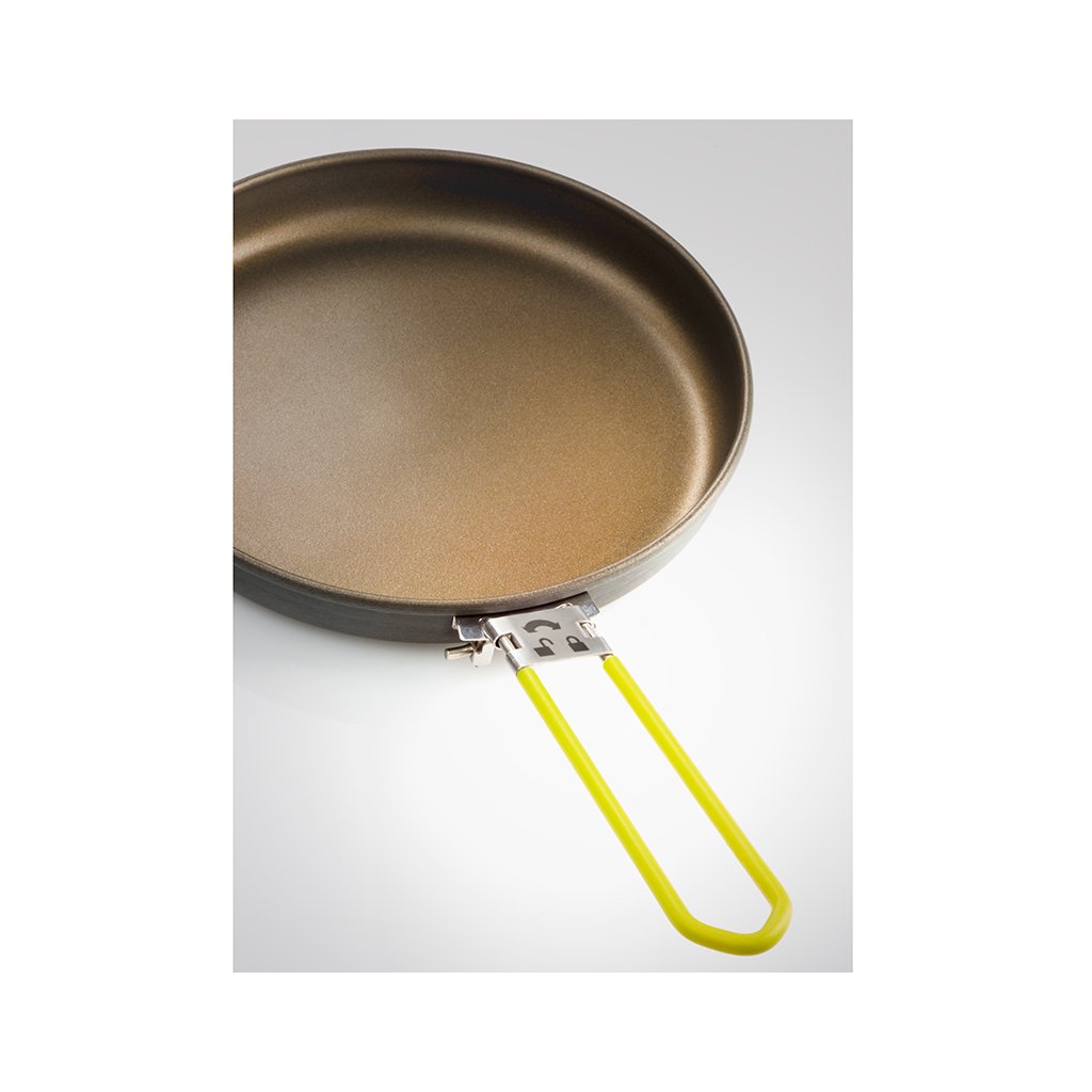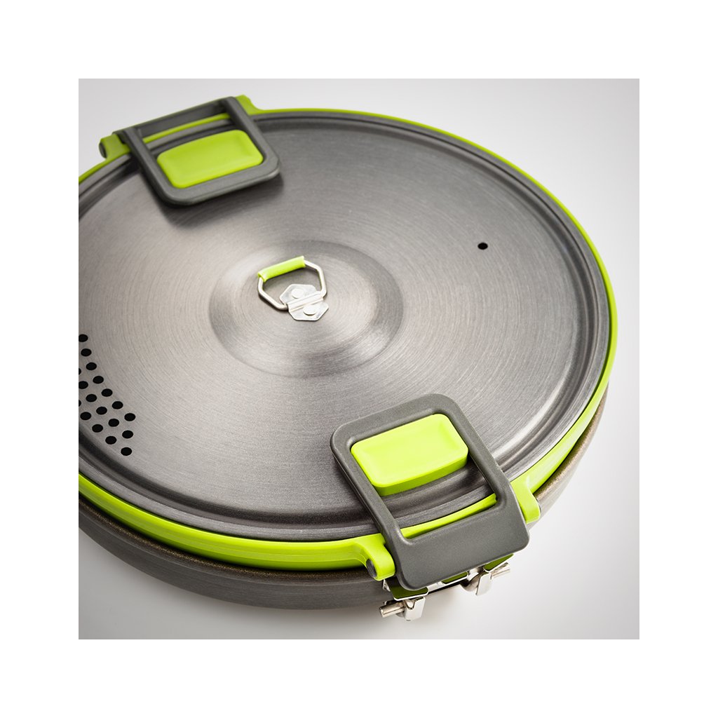 Set of Teflon 9" frying pan and efficient Escape 3l folding pot with ingenious system for perfect heat distribution. The pot bottom, pan and perforated lid are made of hard anodized aluminum, which guarantees the highest efficiency of heat distribution, chemical resistance and maintains a very light weight. The inner bottom of the GSI EscapeHS Pot and the inside of the pan are made of 3-layer anodized aluminum, hardened with Radiance® technology, a maximum non-stick, scratch-resistant surface. The folding sides of the pot and the thumb guards are made of silicone. The pot can be folded to a minimum height of 5.3cm. The pan and pot are suitable for all types of outdoor cookers. However, they are definitely not designed for cooking over an open flame.