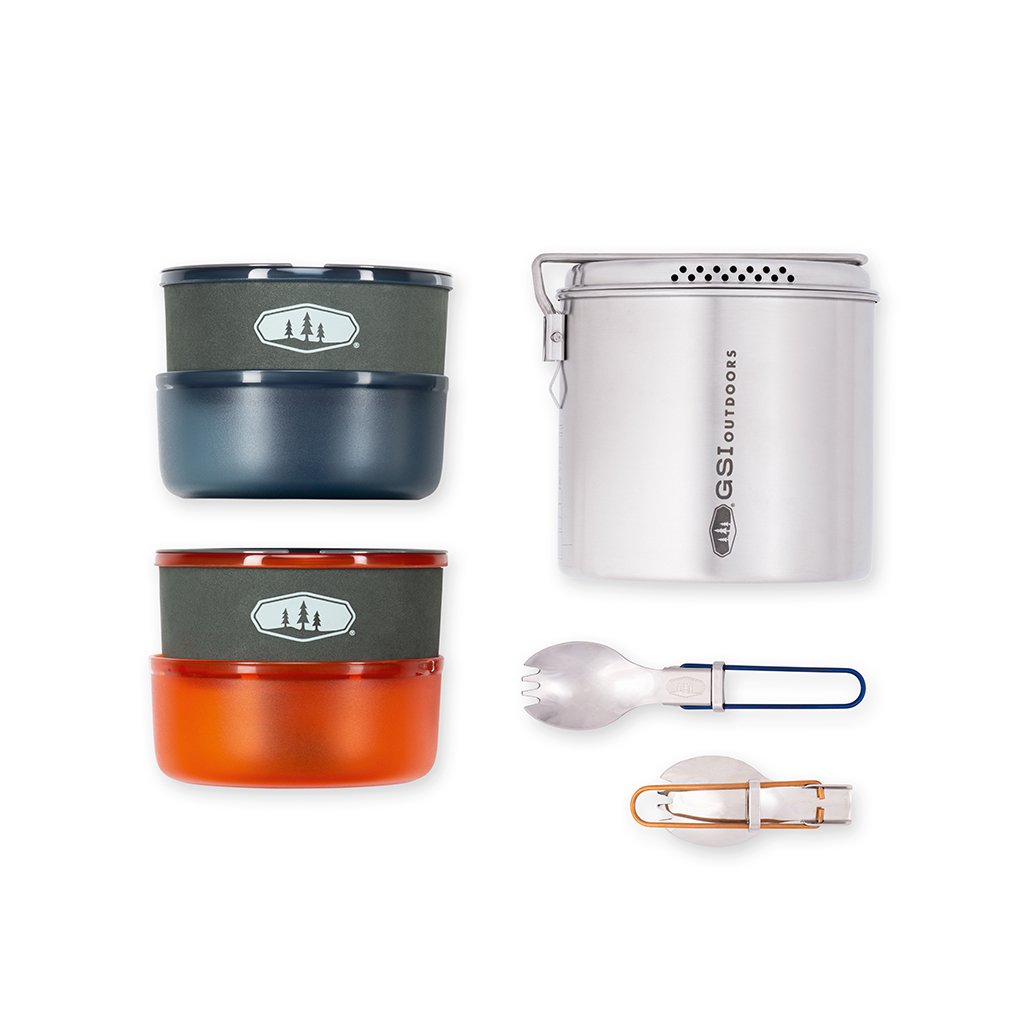 The Glacier Dualist is a 2-person cookware set with a 1.8L main saucepan made of high-quality Glacier Stainless Steel. The set includes 2 bowls, 2 cups with perforated lids for drinking, 2 folding spoon forks, a perforated lid for straining water and a cover for the whole set that doubles as a water container or basin. The entire set folds so neatly into the main saucepan that there's room for a GSI Isobutane Fuel 230g gas cartridge and a GSI Pinnacle Canister Stove, but these are not included.