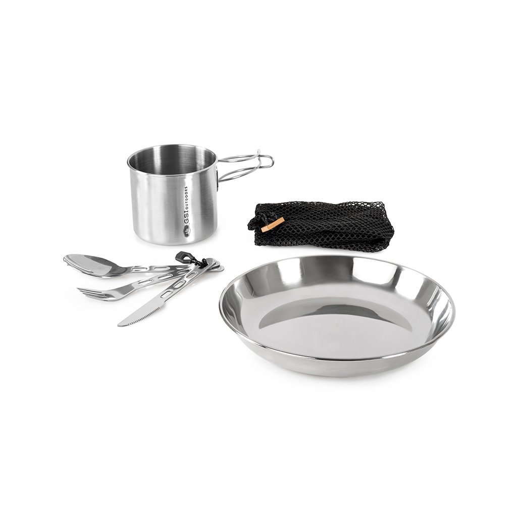 The most durable one-person cookware set from GSI Outdoors. Glacier Stainless 1 Person Set is a set of deep plate, cutlery and pot, complete in premium stainless steel. Additional benefits include a dishwasher-safe or volume scale stamped inside the mug.