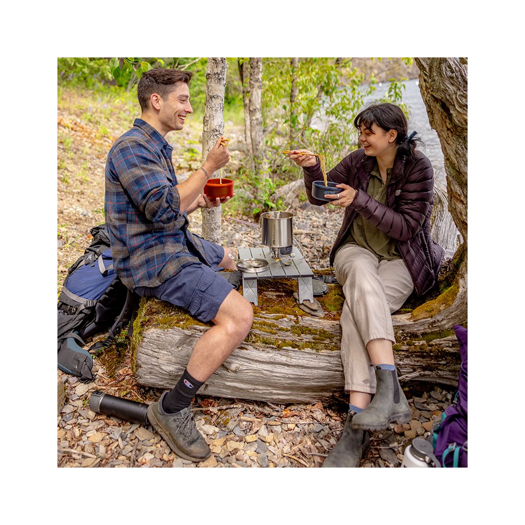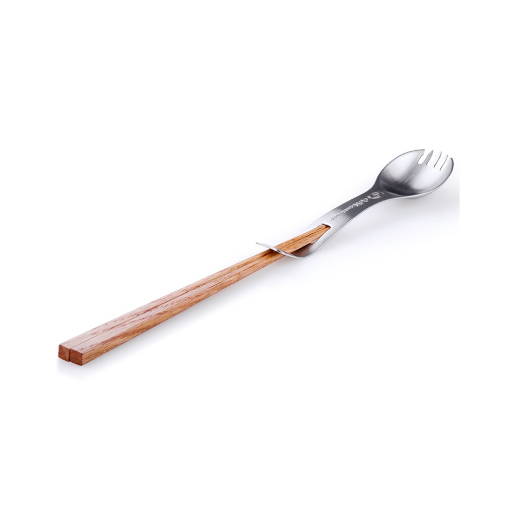 Stainless steel spork with wooden sticks is a great companion for every adventurer, with extra multifunctional use. The chopsticks simply extend the spoon and you can stir or eat directly from the pot. The spoon is deep enough to scoop soup or cereal, and the fork tines work great for pasta.