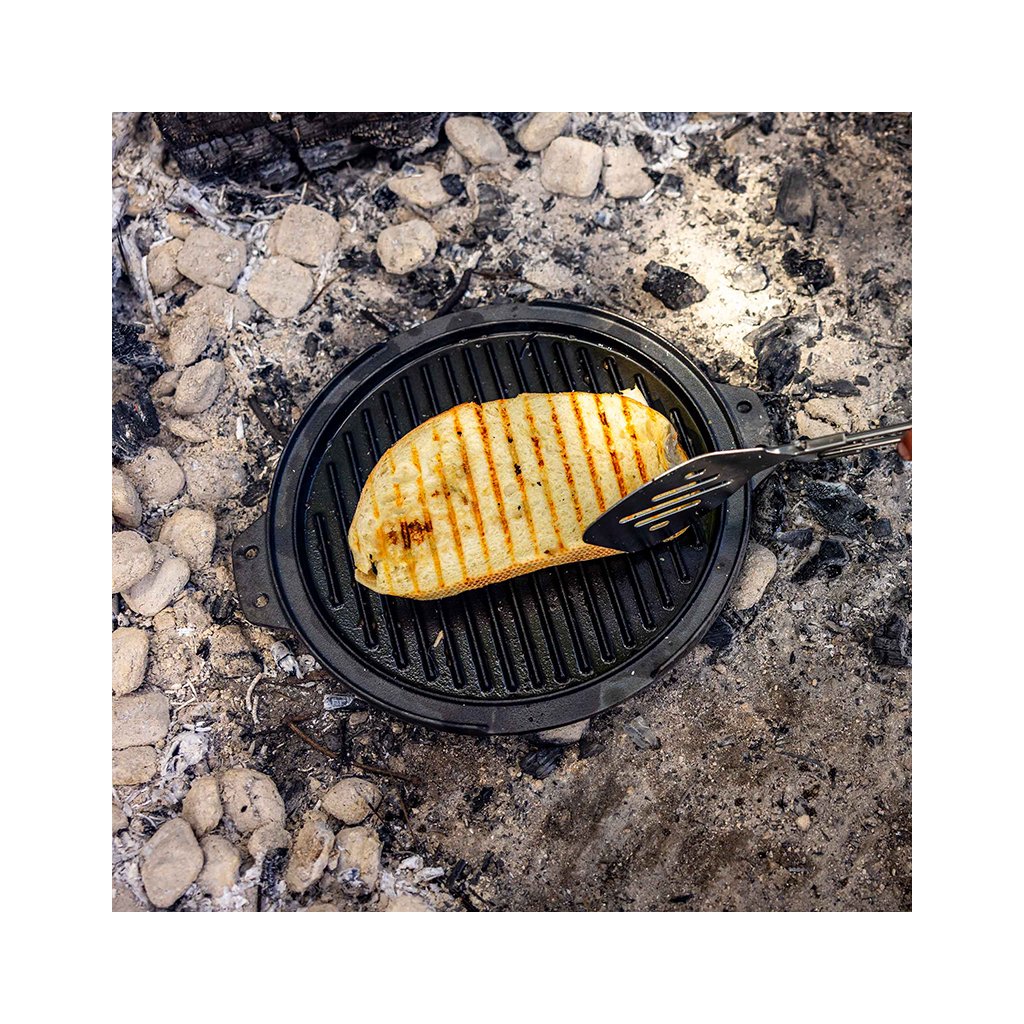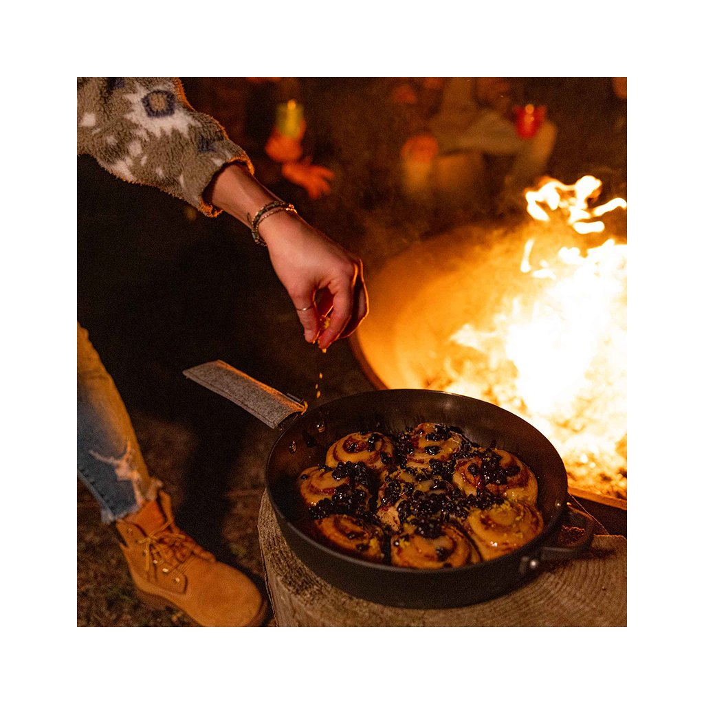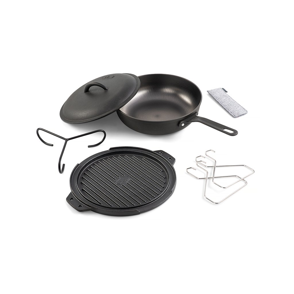 Guidecast Cookset is a cast iron cookware set designed for cooking on an open fire. The set consists of a deep frying pan (diameter 26 cm) with lid, a double-sided cast iron grill plate, 2 wire handles for safe handling, a stable universal tripod-stand and a woolen heat-resistant oven mitt. The pan, lid and griddle are made from high quality cast iron steel which conducts heat well and is compatible with all types of heating - from using direct heat/charcoal to induction and conventional electric oven. The wire handles are stainless steel and the potholder is made from 100% recycled wool felt. The cast iron plate can be used either on its own or as a grill grate directly inside the pan. This makes it easy to prepare a main course with a side dish or even a pizza.