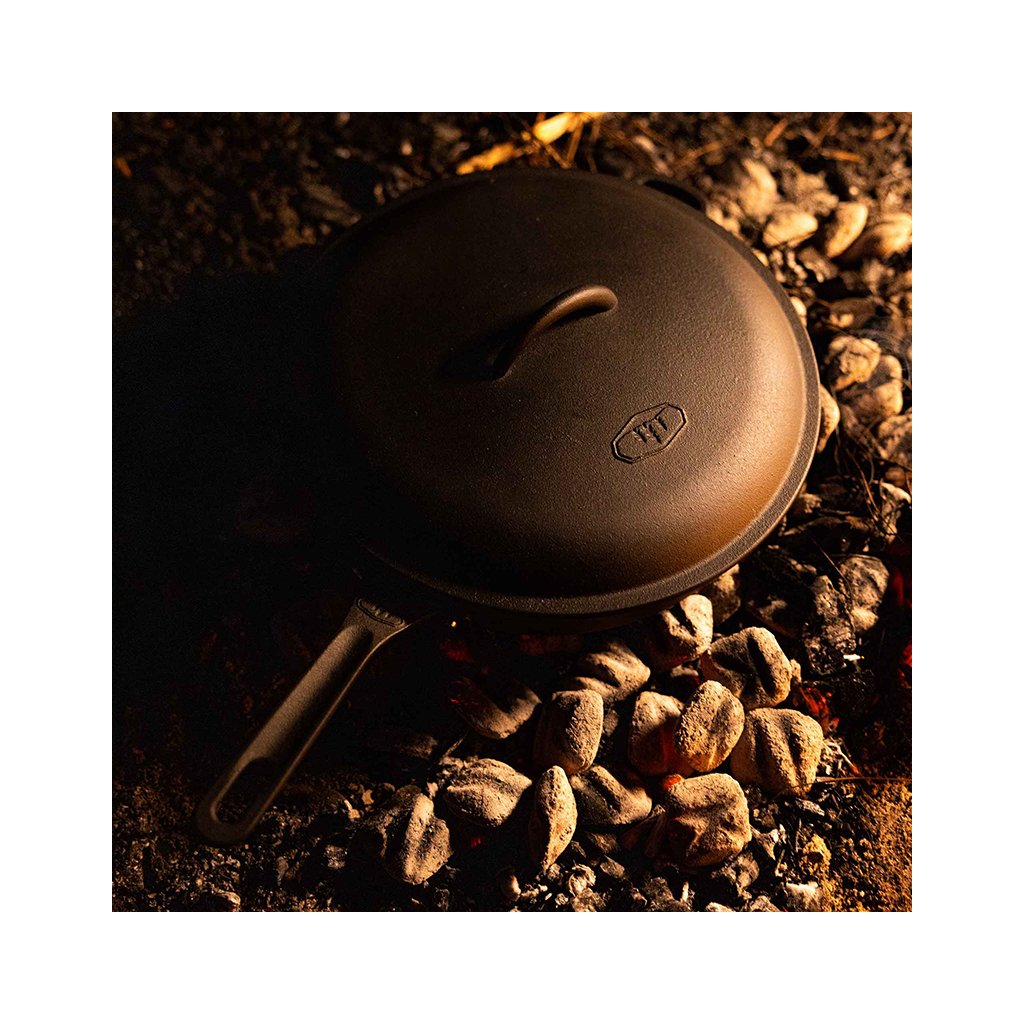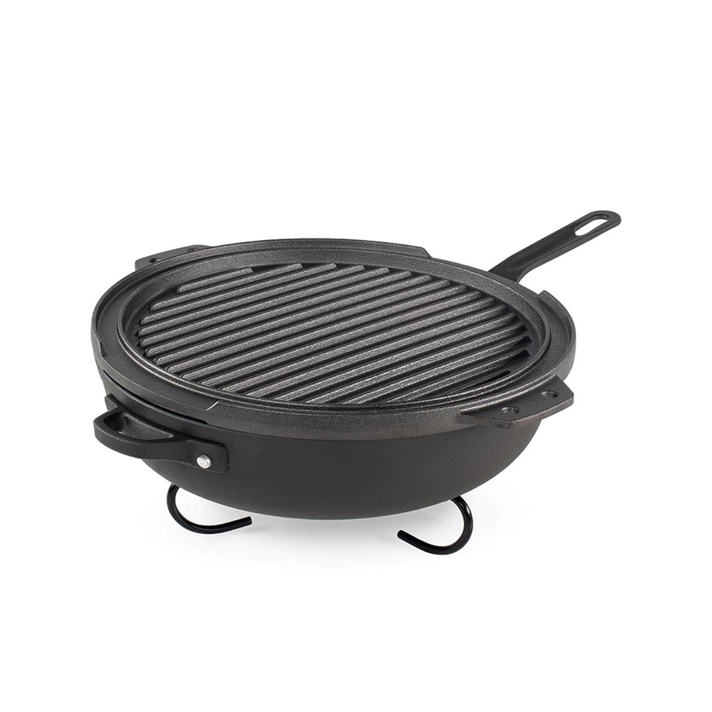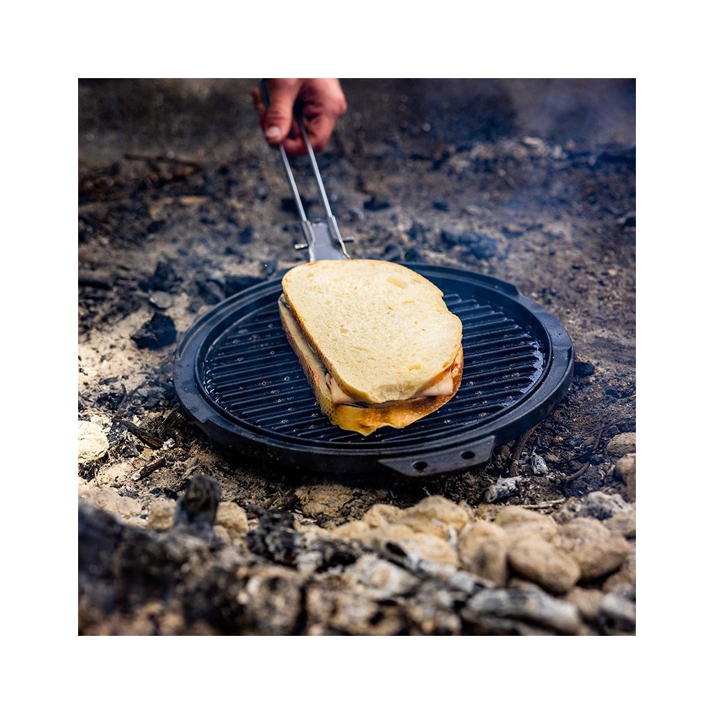 Guidecast Cookset is a cast iron cookware set designed for cooking on an open fire. The set consists of a deep frying pan (diameter 26 cm) with lid, a double-sided cast iron grill plate, 2 wire handles for safe handling, a stable universal tripod-stand and a woolen heat-resistant oven mitt. The pan, lid and griddle are made from high quality cast iron steel which conducts heat well and is compatible with all types of heating - from using direct heat/charcoal to induction and conventional electric oven. The wire handles are stainless steel and the potholder is made from 100% recycled wool felt. The cast iron plate can be used either on its own or as a grill grate directly inside the pan. This makes it easy to prepare a main course with a side dish or even a pizza.