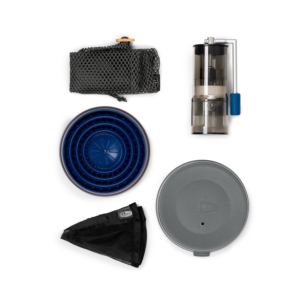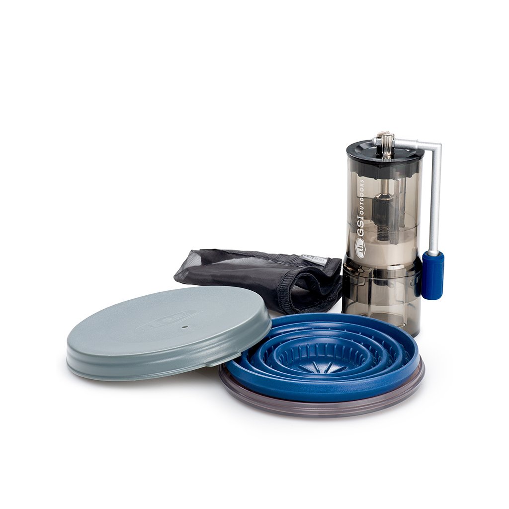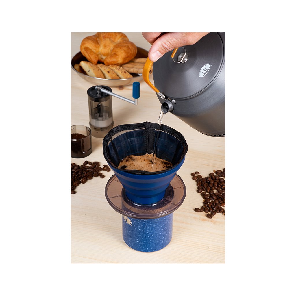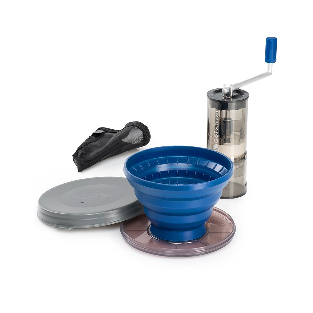 GSI JavaGrind hand grinder and GSI Collapsible JavaDrip filter set in size #4. The drip filter has the capacity to brew 1-12 cups of coffee. The bottom knurling makes it hold well on all types of mugs or wide-mouth bottles. The drip filter is collapsible to a minimum height of 2.5cm. For safe transport, it is also fitted with a lid that can also be used as a coaster. The strainer can be easily washed in the dishwasher.