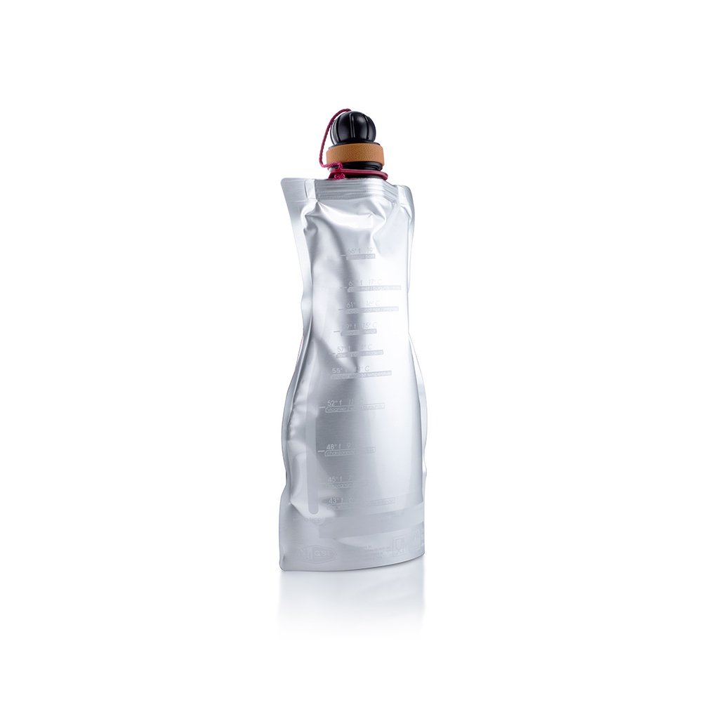 Innovative and stylish foldable red wine decanter. Unique 2 stage closure, wide neck for easy filling and small neck for pouring. The carafe includes a label to describe the contents and date filled.