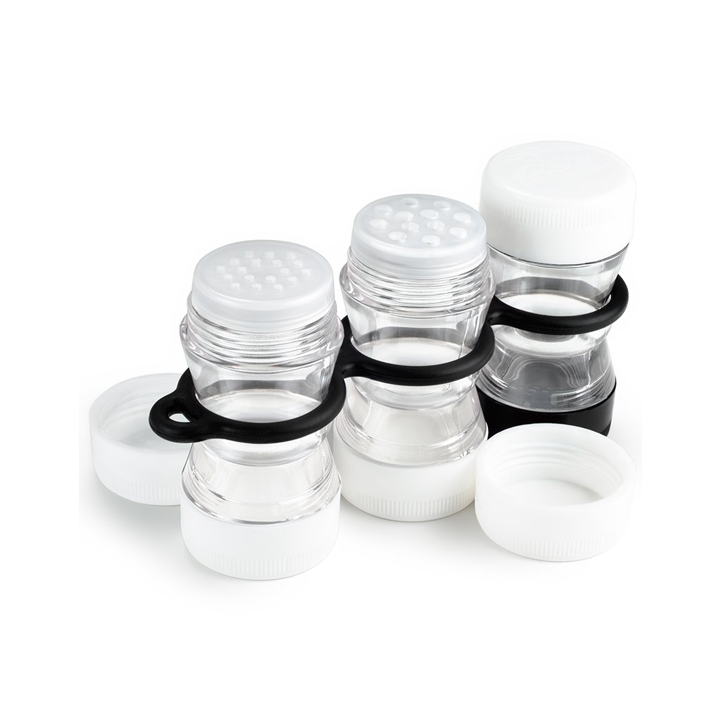 Set of spice jars with watertight lids will keep your spices always dry. The reversible system allows you to pack up to 6 spices. The entire set is simply and easily washable. Unique, lightweight and collapsible spice jars will be welcomed by anyone looking for minimal space and maximum convenience.