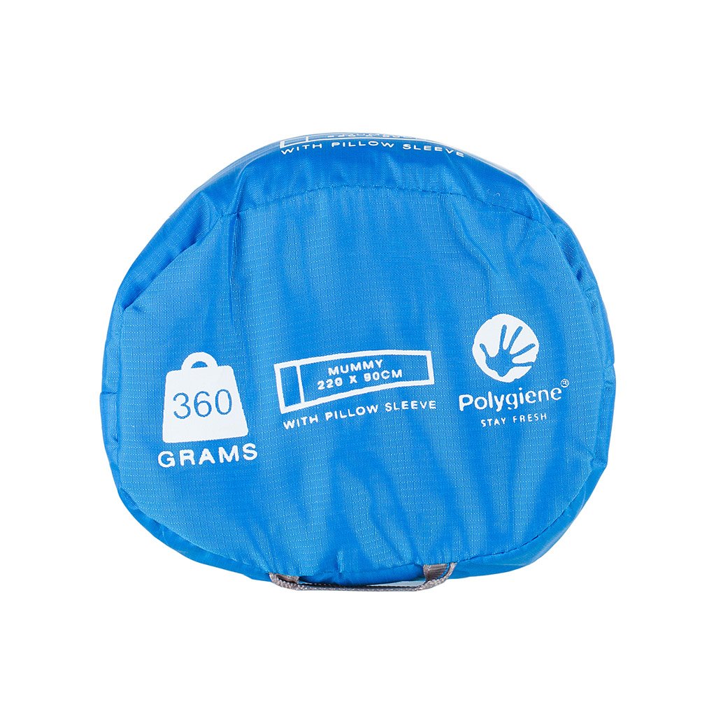 Light, breathable sleeping bag in the shape of a mummy, which can be used separately or as an insert in a sleeping bag. The material is treated with Polygiene® Control of Pour technology, which maintains a fresh scent without going stale with an antimicrobial treatment.
