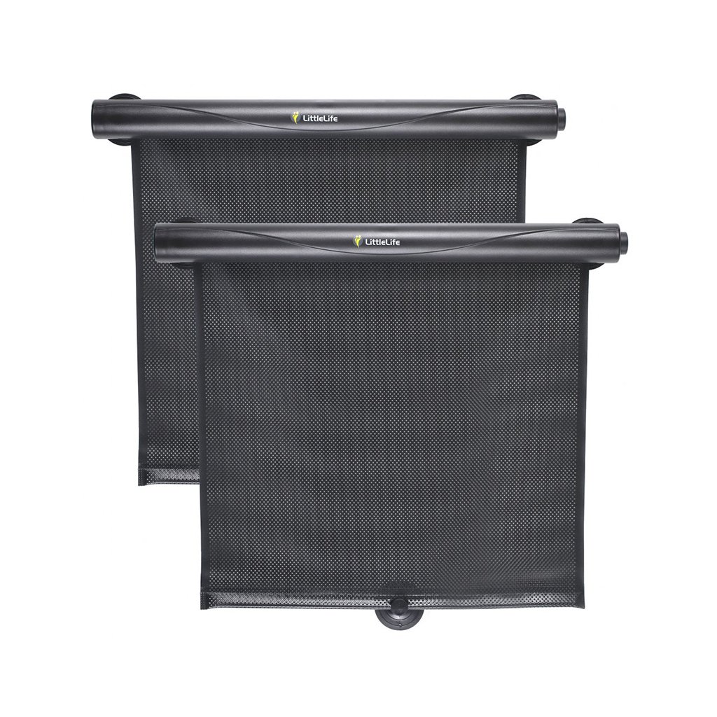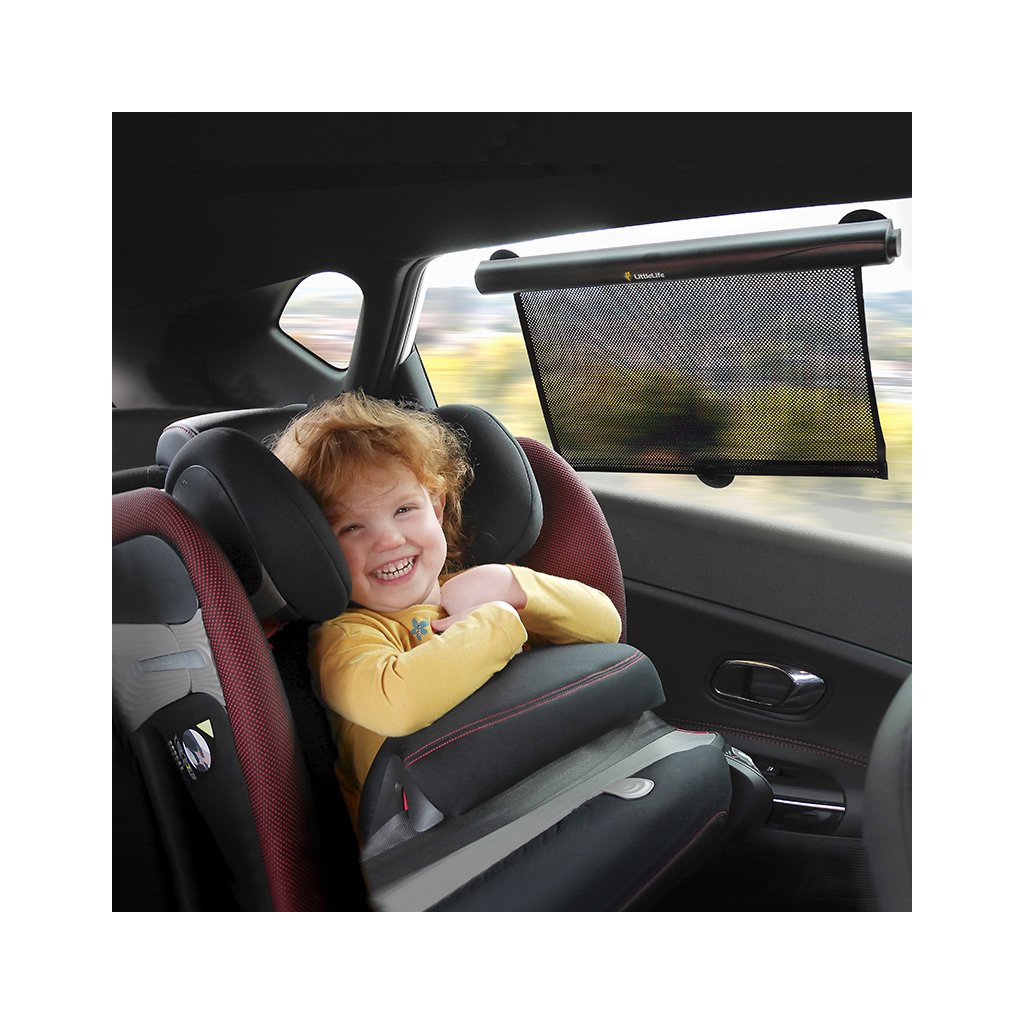 A pair of high-quality car blinds to effectively protect your child from the sun. Easy to attach, adjust and universal fit will fit most cars. A large suction cup holds the shade firmly in place. The roller blind stops up to 90% of UV rays.