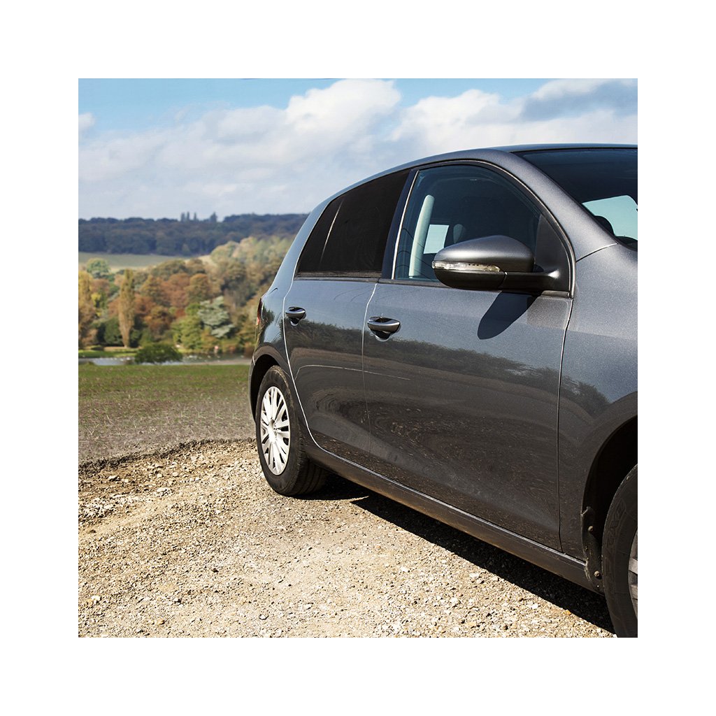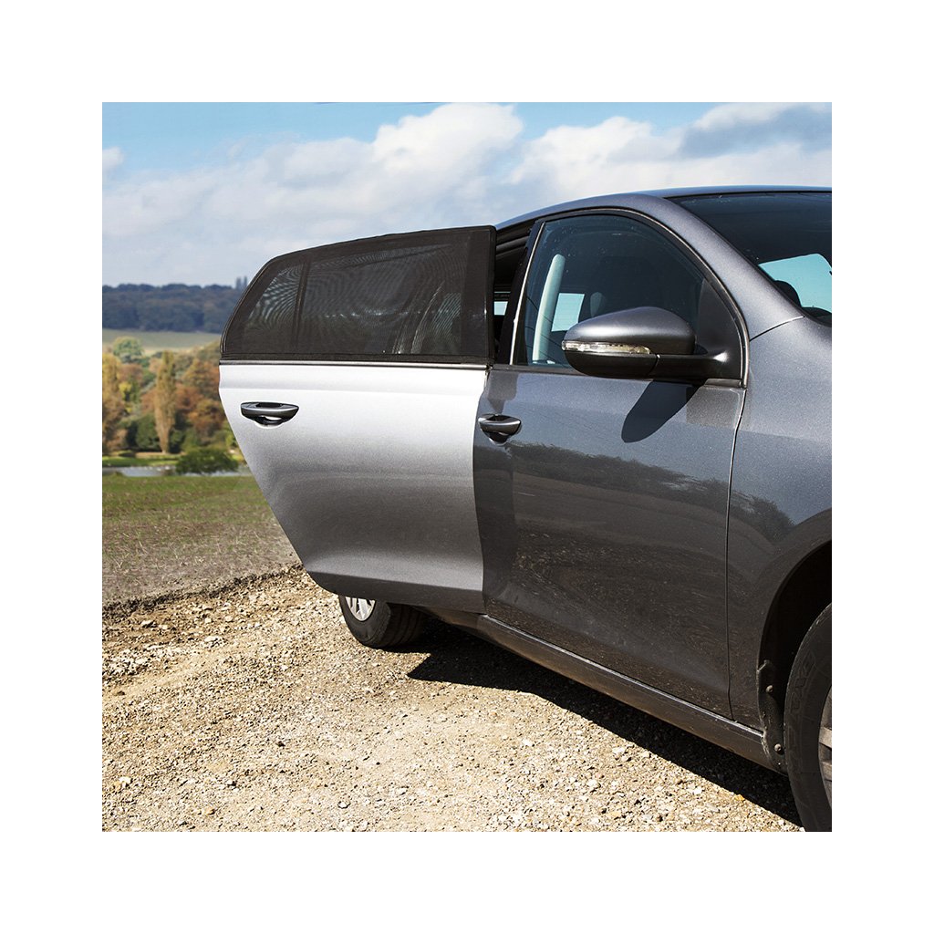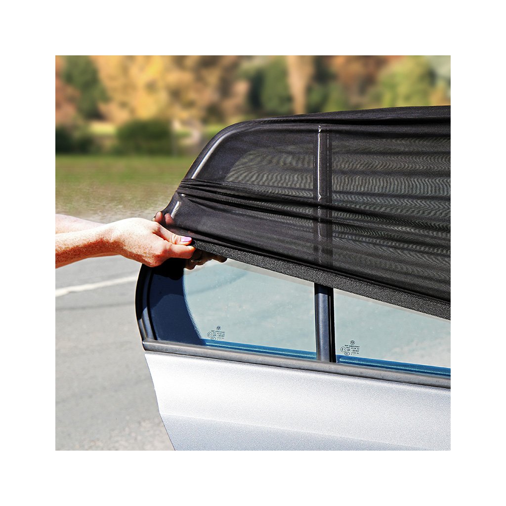 Elastic retractable sun shades for the back door of the car. Shades are supplied in pairs. They are made of stretchy dark mesh that absorbs 70% of UV rays, but is still visible through it. The advantage of this sliding curtain is the possibility of an open window. The fabric is easy to wash.