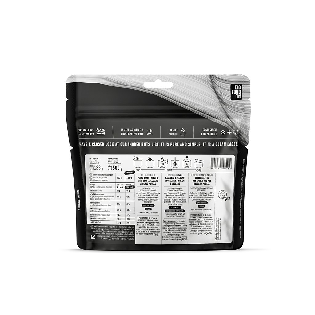 Classic Northern Italian food with a modern twist. Known for its thick and creamy texture, risotto makes the perfect "primo piatto" - a simple and elegant first course. To the hundreds of variations that have been created over the centuries, we decided to add another: freeze-dried risotto made from barley and green lentils combined with red peppers, leeks and pumpkin seeds, all in a creamy avocado mousse. A true vegan treat for outdoor adventure enthusiasts who like to enjoy a delicious hot meal along the way.