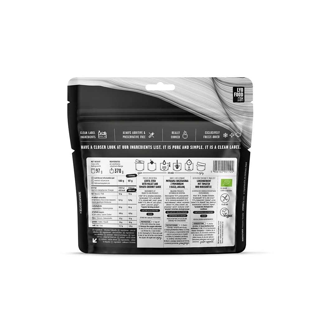 Dal (dhal, daal, dhal) is a famous traditional Indian dish that delights with its distinctive taste, thick and creamy consistency. It is loved by many for its endless variety. At LYOFOOD, we went over red lentils, slowly simmered in a creamy coconut-tomato sauce and served with gluten-free oats. We topped it with crispy green lentils to give it an extra crunchy texture. In short, the ultimate freeze-dried organic version of a classic Indian dish that will keep you warm for hours.