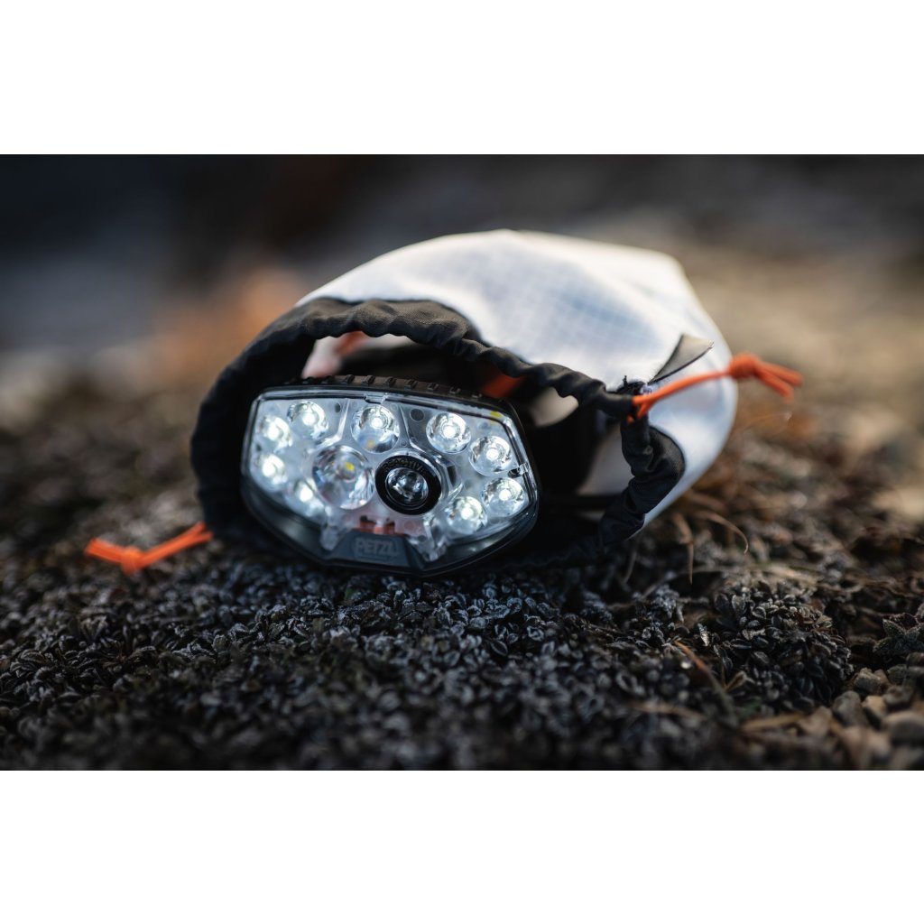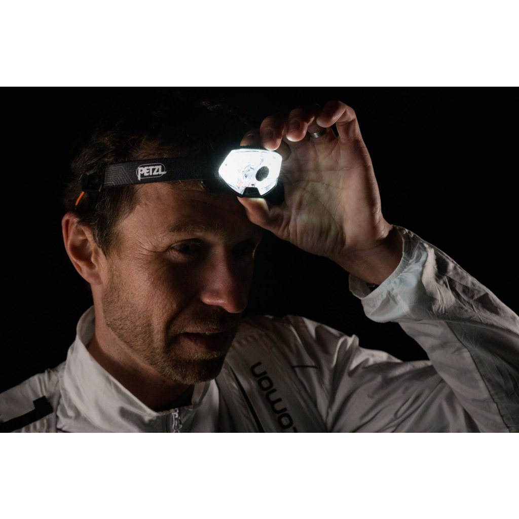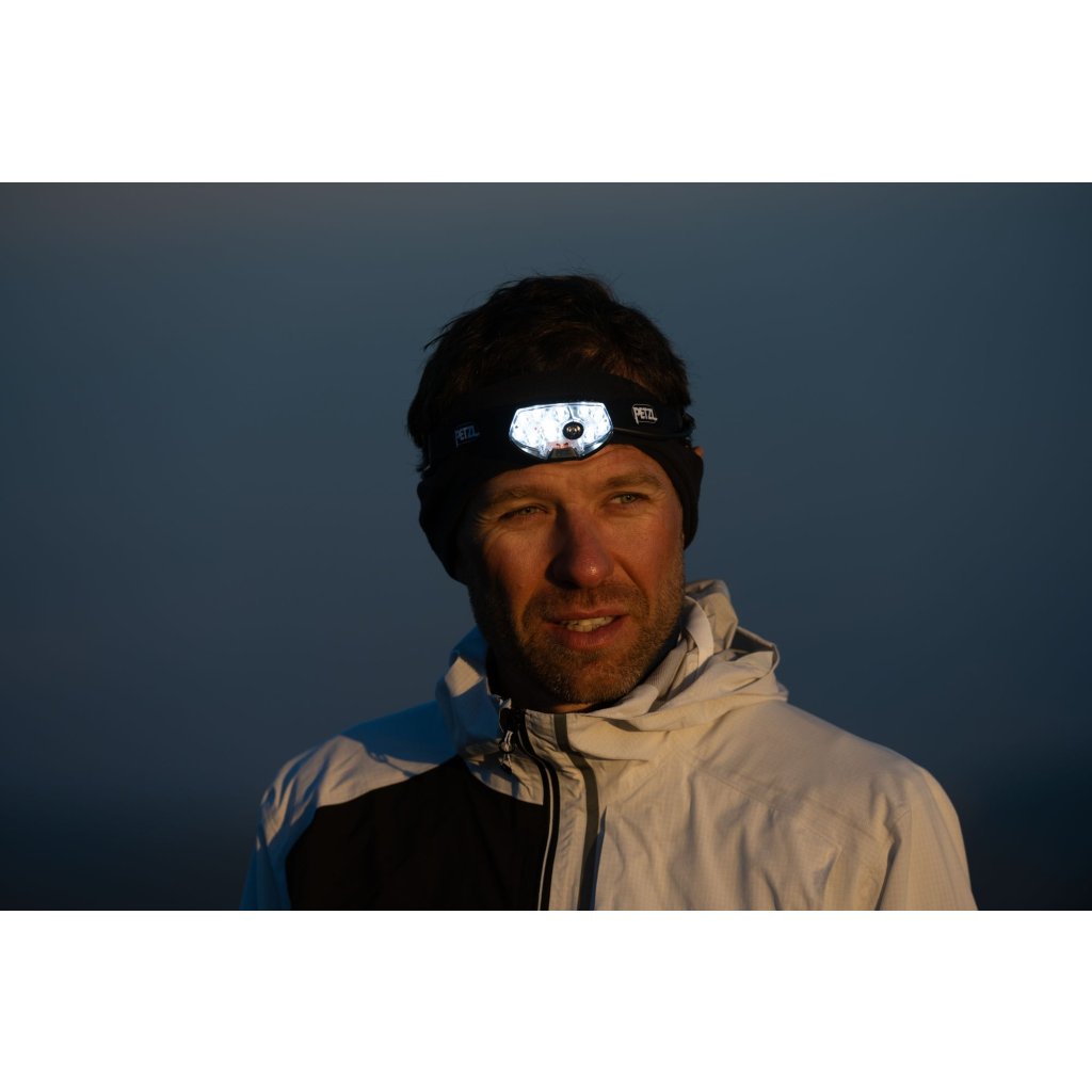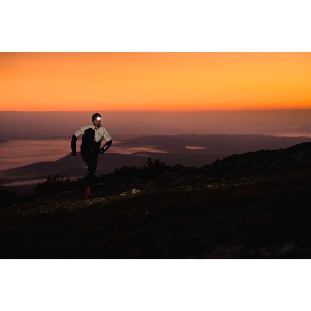 Iconic headlamp for ultra-trail runs, in a new, more powerful design! A new ultra-thin reflector with powerful diodes has reduced the weight of the headlamp. The headband combining an elastic band with a drawstring perfectly holds the comfortably balanced flashlight and battery on the head. Thanks to the REACTIVE LIGHTING® technology used, the lighting intensity adapts to the environment. The light sensor evaluates the ambient light and optimizes the light output, thus saving the battery and extending the lighting time. The battery in the back of the headlamp is equipped with a red light that can optionally be switched between continuous lighting and flashing.Powerful and lightweight: