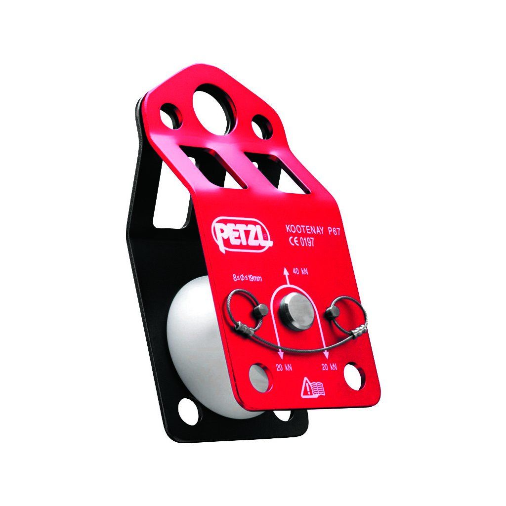 A special pulley with a large space between the disc and the sides allows the passage of knots when tying the rope (lifting large loads to great heights or rappelling with two ropes). The large diameter disc guarantees excellent efficiency. The disc can be blocked with two pins and the pulley can then be used to anchor the rope.
