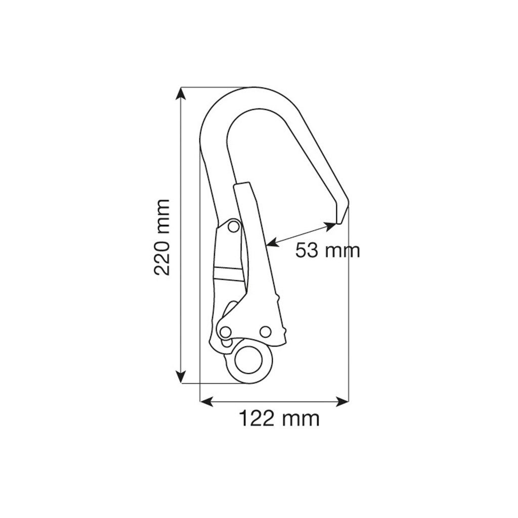 Ocelový jistící hák s dlaňovou pojistkou, pro jištění na velkých konstrukcí jako je např. lešení. Systém zamykání s dvojitou dlaňovou pojistkou zajišťuje vysokou úroveň bezpečnosti a snadnou manipulaci.
