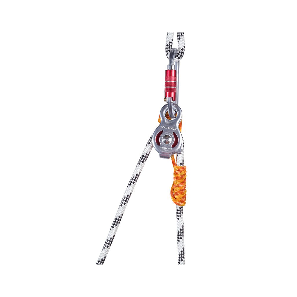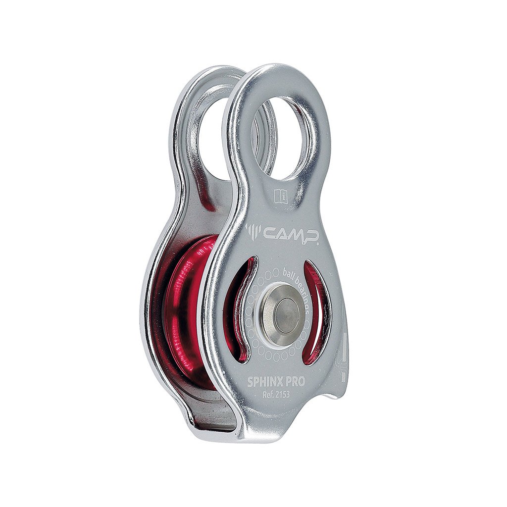 CAMP Sphinx PRO je multifunkční jednoduchá kladka s kuličkovým ložiskem a pevností 25kN. Kladka má pevné bočnice s velkým kotvícím otvorem, kterým lze protočit karabinu i se zámkem. Výstupek na jedné straně umožňuje použití pomocného prusíku.