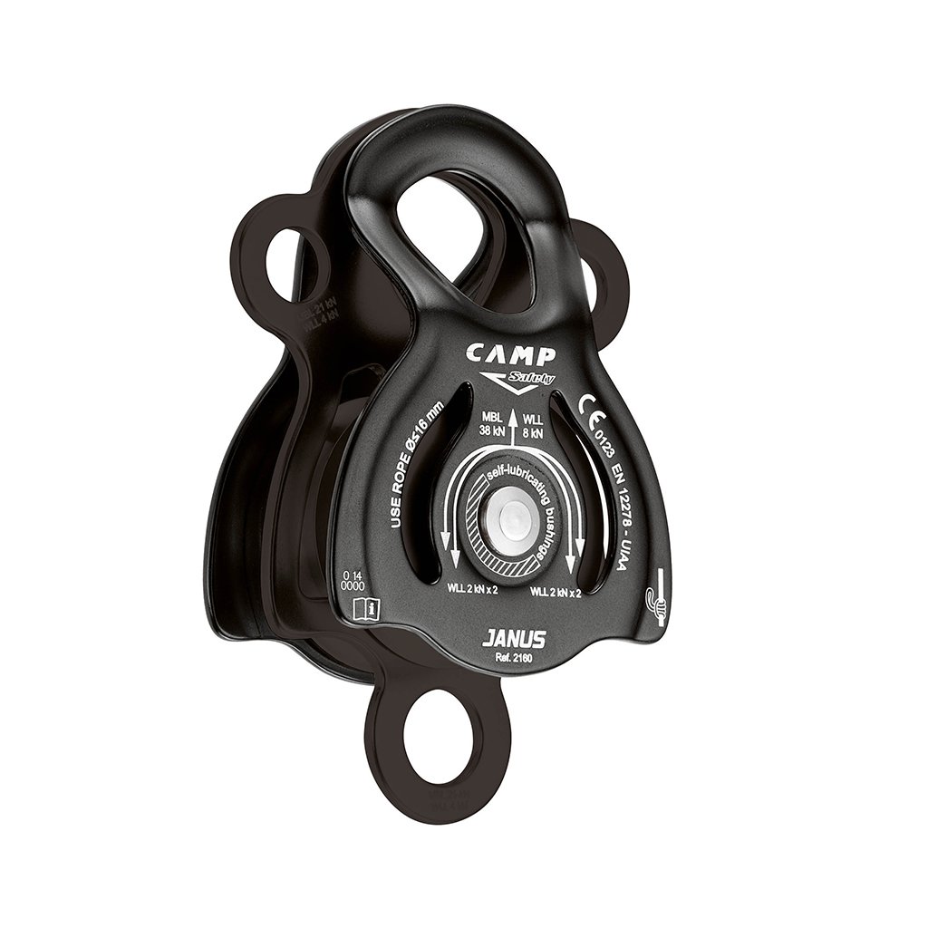 CAMP Janus je multifunkční vysoce účinná dvojitá kladka se samomazným kluzným ložiskem a pevností 38kN. Kladka je vhodná pro snadné zapojení do kladkostroje a je kompatibilní s lany do 16mm. Kladka CAMP Janus s otočnými bočnicemi má horní kotvící otvor ve velikosti pro tři karabiny, horní boční otvory pro jednu karabinu a spodní připojovací otvor taktéž pro jednu karabinu. Prusíkové pomocné smyčky mohou být instalovány po obou stranách kladky (doporučujeme prusík ze smyce Aramide), což ocení zejména záchranné složky. CAMP Janus je vhodná pro záchranné scénáře i pracovní použití.