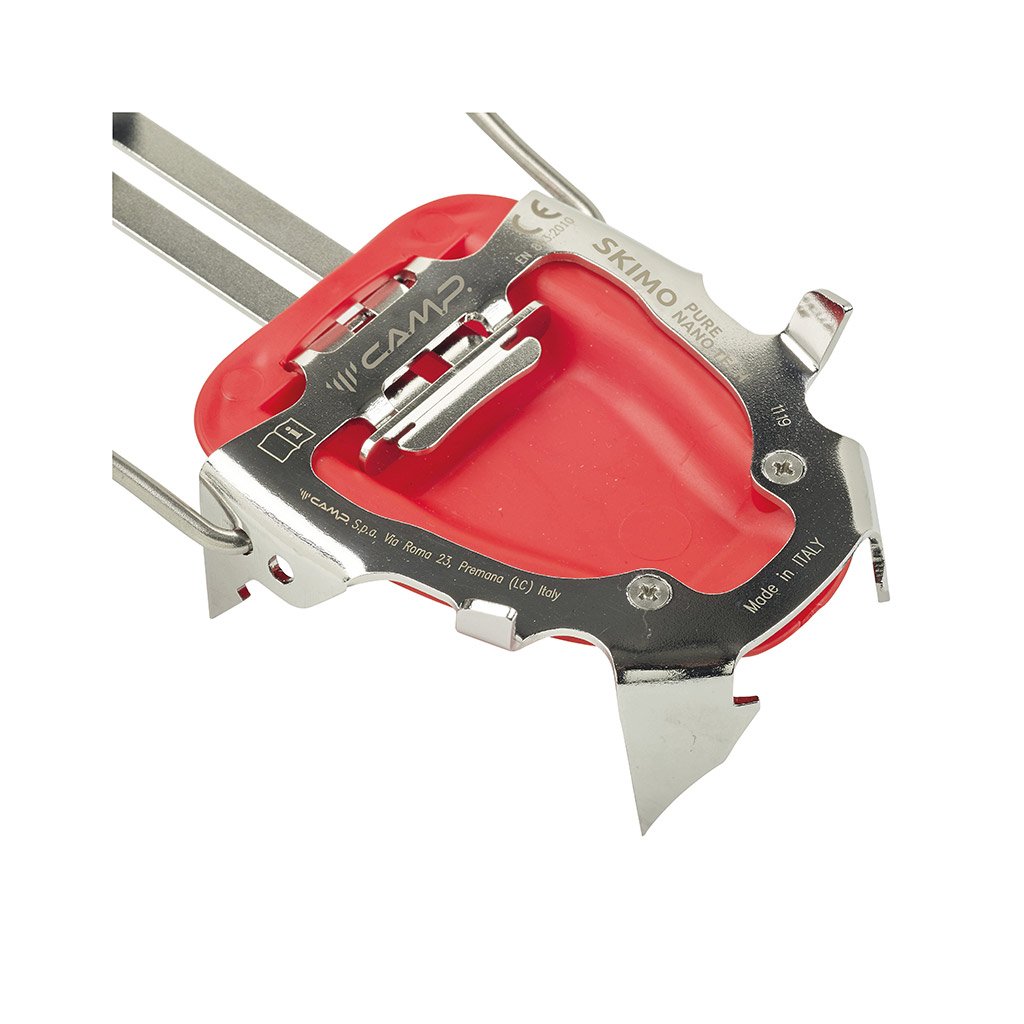 SKIMO Pure Nanotech jsou nejlehčí ocelové mačky na světě vhodné pro skialpinismus i závodní skialpinismus. Mačky jsou vyrobené nanotechnologií Sandvik Nanoflex, vycházející ze speciální oceli, která je o 70% pevnější a 20% tvrdší než tradiční oceli, což umožňuje použít tenčího průřezu (1,8 mm), což dělá mačky nejen lehčí, ale i pevnější a odolnější. Výhodou maček Skimo Pure Nanotech je středový propojovací můstek, který má otvory vrtané asynchronně ve dvou řadách a je tím tak umožněno přesnější nastavení velikosti mačky. Další vychytávkou je přizpůsobení velikosti na menší boty a to jen jednoduchým posunutím spojovacího můstku na hranu paty. Mačky lze tak snadno přizpůsobit na velikost bot 210-330mm (velikost EU 36-46). Mačky SKIMO Pure Nanotech jsou připravené pro boty s hrazdičkou vpředu (Automatické mačky), kterou lze navíc i obrátit vzhůru nohama a přizpůsobit tak mačky i na boty, které mají přední hrazdu nižší, než standardní boty. Toto propracované přední upínání boty se jmenuje T-STOP systém. Mačky lze optimalizovat i pro boty bez hrazdičky, stačí dokoupit doplňkový díl CAMP SKIMO Semi-Automatic Toe Bail (2589). Mačky SKIMO Pure Nanotech umožňují také nahradit středový spojovací můstek za CAMP Skimo Dyneema Linking Strap (2596), čímž ještě snížíte jednak hmotnost maček a zároveň také velikost balení.