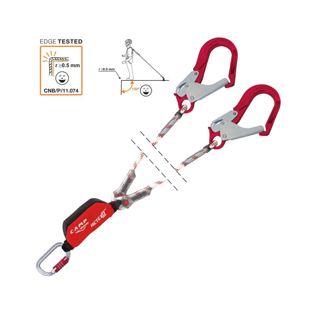 Retexo Rope kombinuje pevnost a odolnost semi-statických lanyardů se skvělými absorbčními vlastnostmi páracího tlumiče pro bezpečné zachycení pádu. Lanyardy jsou vyrobeny ze semi-statického 10,5mm lana CAMP Prium, které vyniká odolností proti otěru a vysokou pevností při zatížení. Šité konce lanyardů jsou opatřeny průhlednými koncovkami pro jednoduchou kontrolu stavu. Systém je opatřen ocelovou oválnou karabinou se šroubovací pojistkou zámku CAMP Oval XL 3Lock, která slouží pro připojení k postroji. Pro zajištění slouží háky z hliníku CAMP Hook Plus se světlostí 62mm. Celková délka absorberu s lanyardy a jistícími háky je 135cm. Certifikováno pro horizontální použití s pádem přes hranu o poloměru r >= 0.5 mm.