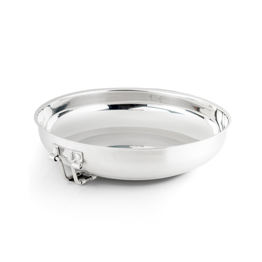 Vysoce odolná pánvička z nerezové oceli a sklápěcí rukojetí. Pro snadnou manipulaci a bezpečné uchopení je rukojeť potažena silikonem.