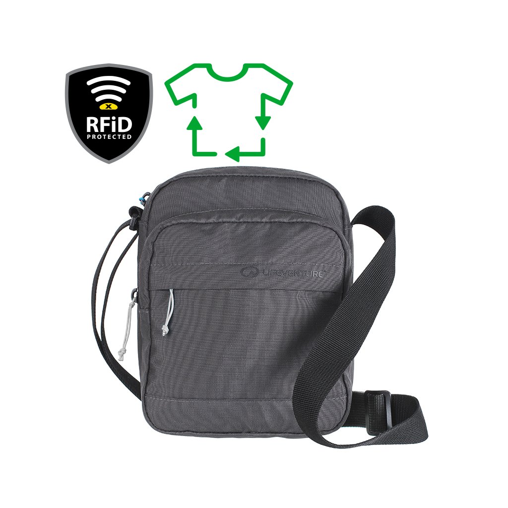 Moderní brašna přes rameno z recyklovaného materiálu, pro uschování peněz, dokladů a jiných cenností. Strana přiléhající k tělu má měkkou podšívku pro větší pohodlí. Kapsička má na hlavní kapse RFiD ochranu, která spolehlivě chrání osobní data při cestování, placení v obchodech, či na letišti. Další 2 menší kapsičky jsou bez RFiD ochrany.
